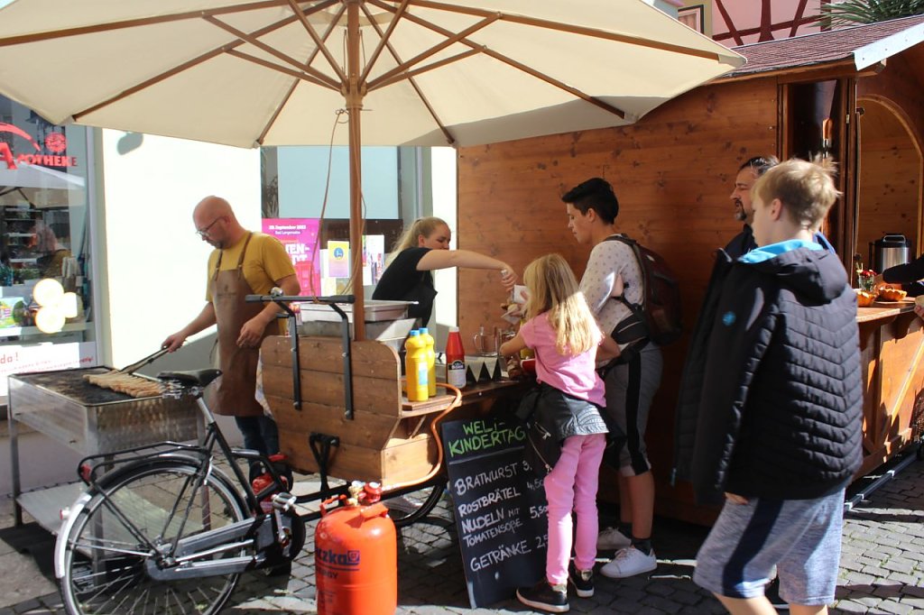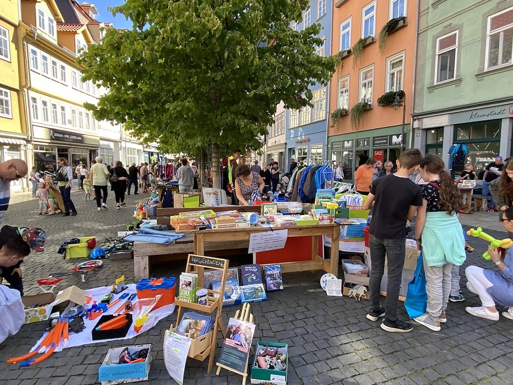 Das ZDF war in die Rosenstadt gekommen, um die beliebte Rateshow 1-2-3 open air vor Publikum zu zeigen. Schnell herrschte eine fröhliche und ausgelassene Stimmung, die sich über den ganzen Tag fortsetzen sollte. Viele Innenstadthändler nutzten das tolle Rahmenprogramm zum Weltkindertag, um sich an der alljährlichen Aktion Heimat shoppen zu beteiligen und ihre Geschäfte auch an diesem staatlichen Feiertag zu betreiben. Für einige Touristen kam der ausschließlich in Thüringen zum Feiertag erhobene Anlass des Weltkindertages schon am Morgen etwas überraschend, als sie vor verschlossenen Bäckerläden standen. Dafür wurden sie mit einem erlebnisreichen Spätsommertag entschädigt, der die Marktstraße mit einem kindgerechten Flohmarkt, Hüpfburgen, Ständen und Buden mit Basteleien, Essen und sportlicher Betätigung füllte. Auf dem Neumarkt stand die große Bühne für die beliebte Kindersendung des Zweiten Deutschen Fernsehens, die von 11.30 bis 17 Uhr Kindern und Eltern Freude bereitete. Lange Schlangen bildeten sich beim Hauptsponsor des Tages, der Drogeriekette DM, die mit Schminkmobilen für Mütter und Töchter angerückt war. Dazu tummelten sich mehrere Vereine und Schulen, die sich und selbst kreierte Dinge präsentierten. Polizei, Feuerwehr, das deutsche Rote Kreuz und auch der THC waren vor Ort und fügten sich in das von der Stadtverwaltung bestens durchorganisierte Geschehen ein.