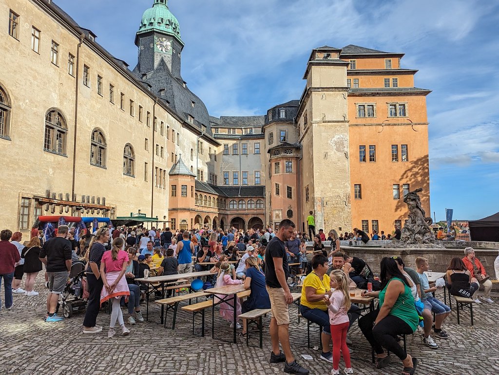 Apropos Schloss: Dort fand der Schlösserkindertag statt, der ebenfalls gut besucht und alle Führungen restlos ausgebucht waren. So gab es eine Märchenführung im Kostüm und zwei Kellerführungen mit Schatzsuche. Die historische Tanzgruppe lud zum Mitmachen ein und das Liebhabertheaterstück Die goldene Gans war bis auf den letzten Platz belegt. Am Stand des Landesverbandes der Jugendkunstschulen Thüringen wurde kreatives Gestalten mit Naturmaterialien angeboten.