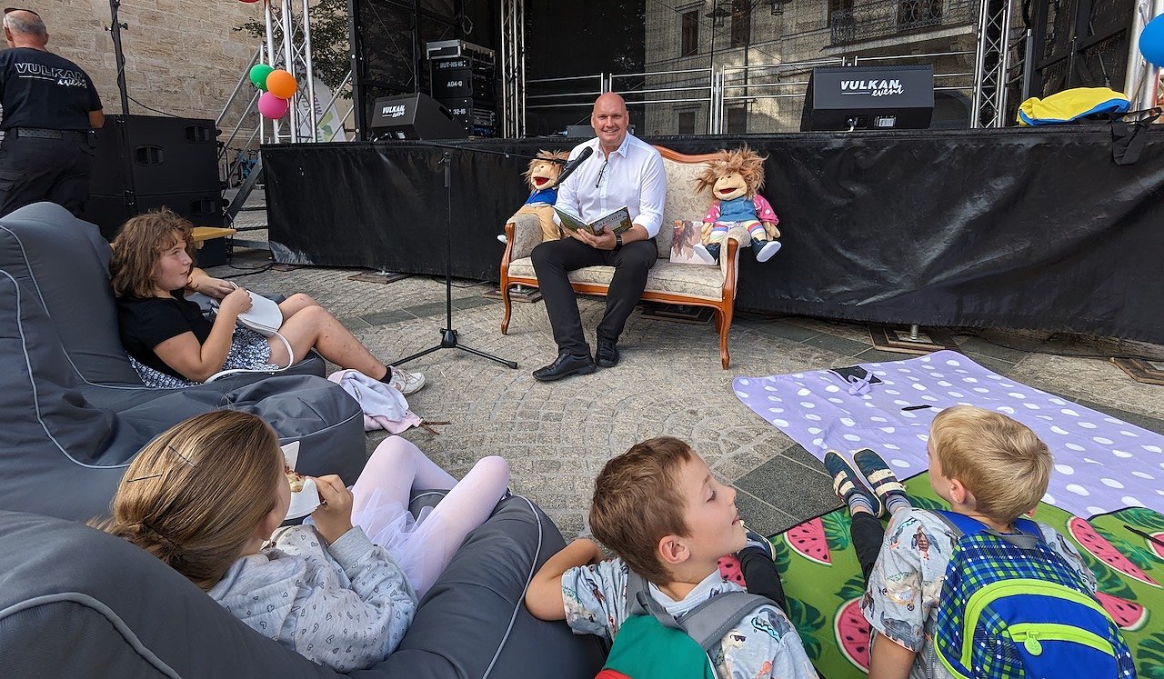 Bürgermeister Steffen Grimm begeisterte die Kinder beim Kinder-und Jugendfestival mit Kindergeschichten (Foto: Janine Skara)