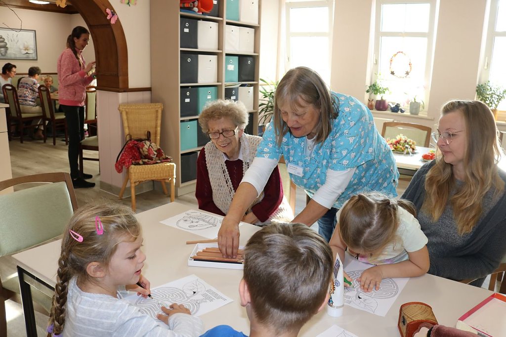 Dabei waren sowohl pflegebedürftige Bewohner als auch Senioren aus der Tagespflege. Gemeinsam mit Kindern aus der Kita Lackstöckchen Sundhausen haben sie das Thema Zahngesundheit und zahngesunde Ernährung spielerisch mit Würfelspielen und Memory erarbeitet, Zähne aus Salzteig und eine Zahnputzgirlande aus Buntpapier gebastelt. Als nachhaltige Erinnerung soll somit das Gelernte länger im Gedächtnis bleiben. An weiteren Stationen gab es eine speziell auf die Bedürfnisse der Senioren abgestimmte Aufklärung zu Mundhygiene und Prothesenpflege. Mithilfe von Anschauungsmaterialien konnte die Zahnpflege individuell demonstriert werden.