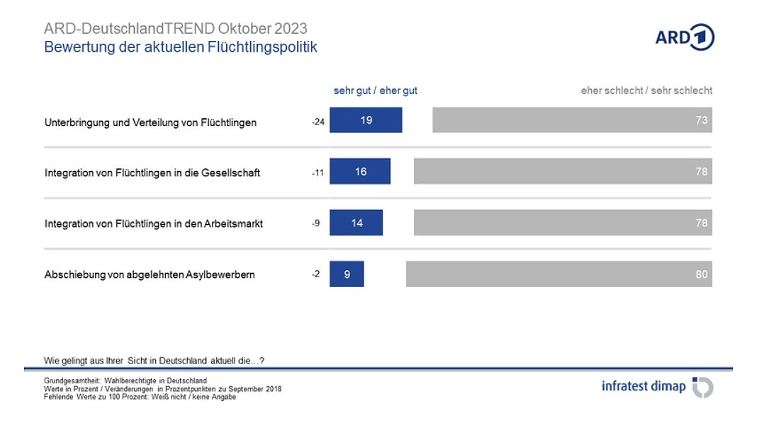 Im Bevölkerungsurteil zur aktuellen Zuwanderungspolitik überwiegt parteiübergreifend die Kritik. Für die Abschiebung abgelehnter Asylbewerber, für die Integration von Flüchtlingen in Gesellschaft wie Arbeitsmarkt vergeben jeweils acht von zehn schlechte Noten, gut sieben von zehn für die Unterbringung und Verteilung von Flüchtlingen.