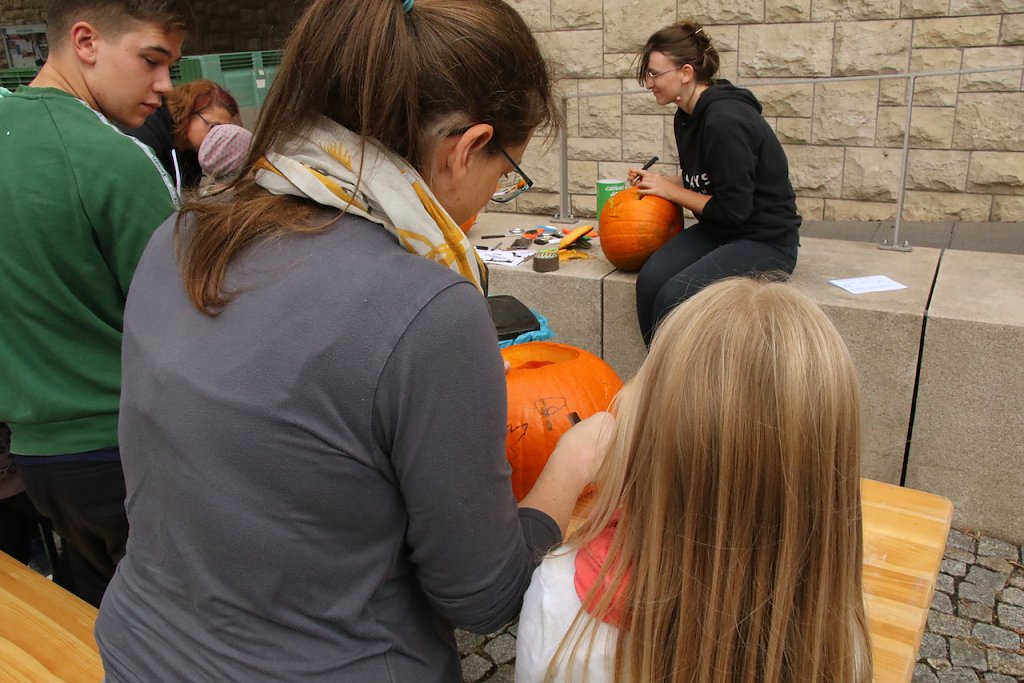 Kürbisse, Kürbisse und noch einmal Kürbisse aber auch Wurst, Blumen, Gemüse, Honig und Handwerkskunst bestimmten heute das Bild auf dem Rathausplatz. Bei Live-Musik und warmer Kürbisssuppe konnte man schlendern und einkaufen. Für Halloween Freunde gab es außerdem die Möglichkeit, dem Kürbis mit dem Messer zu Leibe zu rücken.