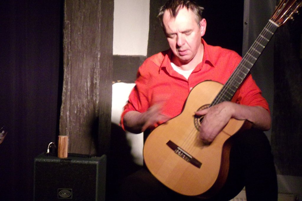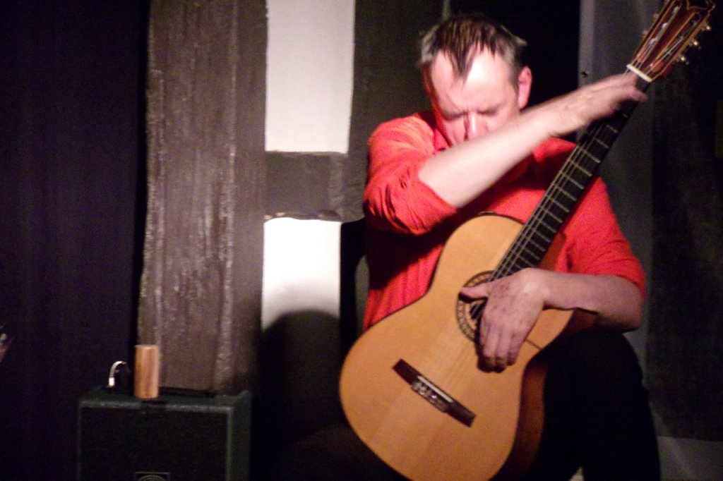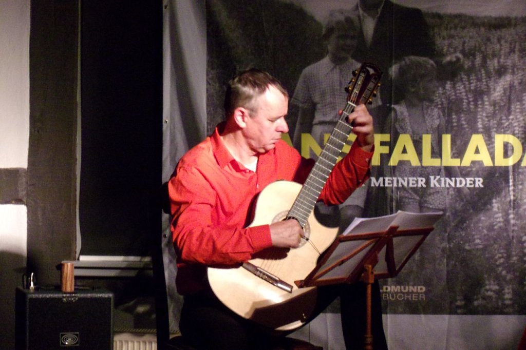 Die Gitarre beherrscht er meisterhaft, hat es nicht nur mit den Saiten. Nein. Er klopft, trommelt, streichelt sie. Frank Fröhlich und seine Gitarre – sie sind an diesem Abend eins. Kurz: Eine Konzert-Lesung vom Feinsten! Kein Wunder, dass die zahlreichen Besucher den beiden Akteuren lang anhaltenden Beifall spenden.