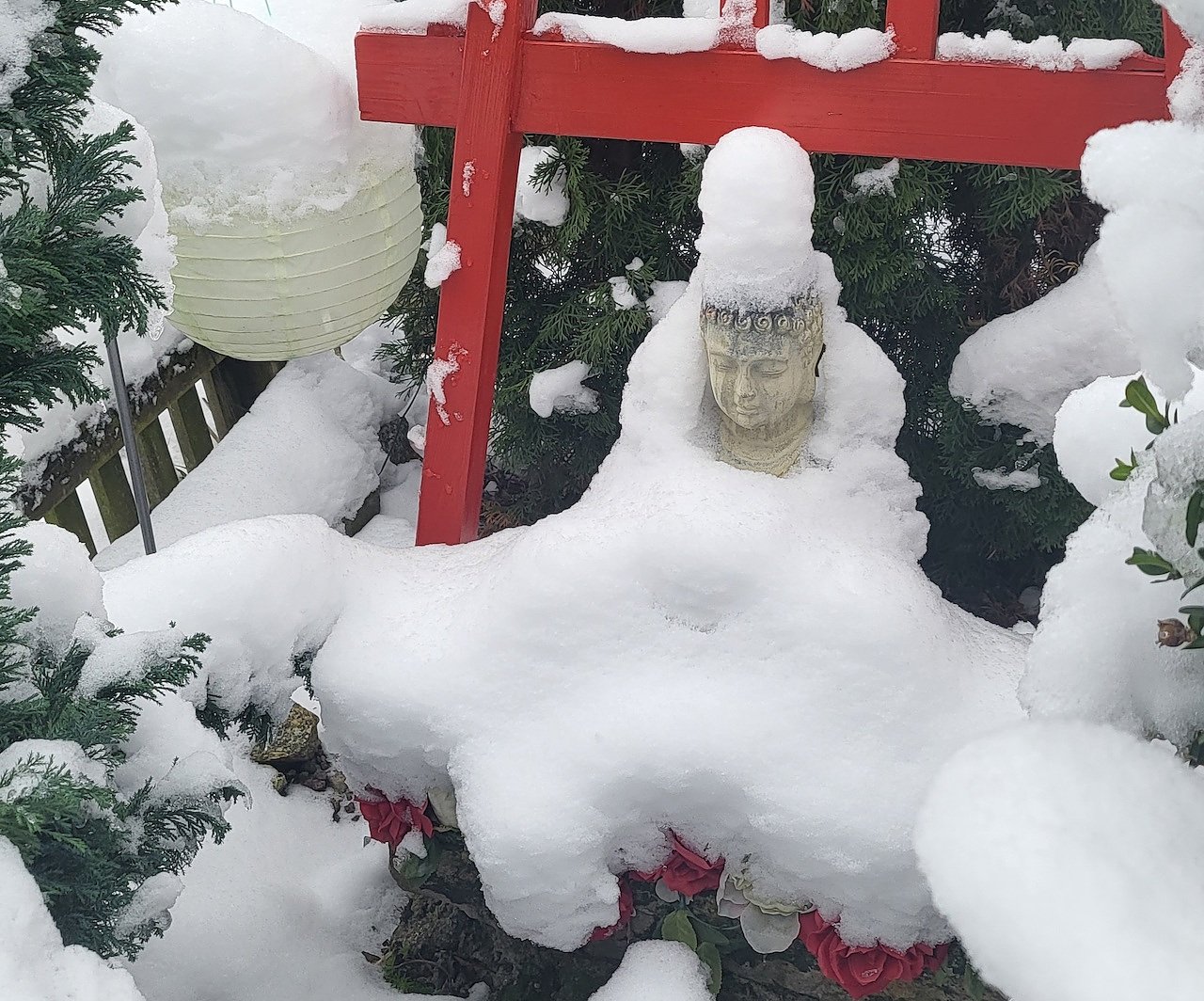 "Hier mal ein leise Momentaufnahme "Buddha" im Schnee. Ob es am Klimawandel liegt?"