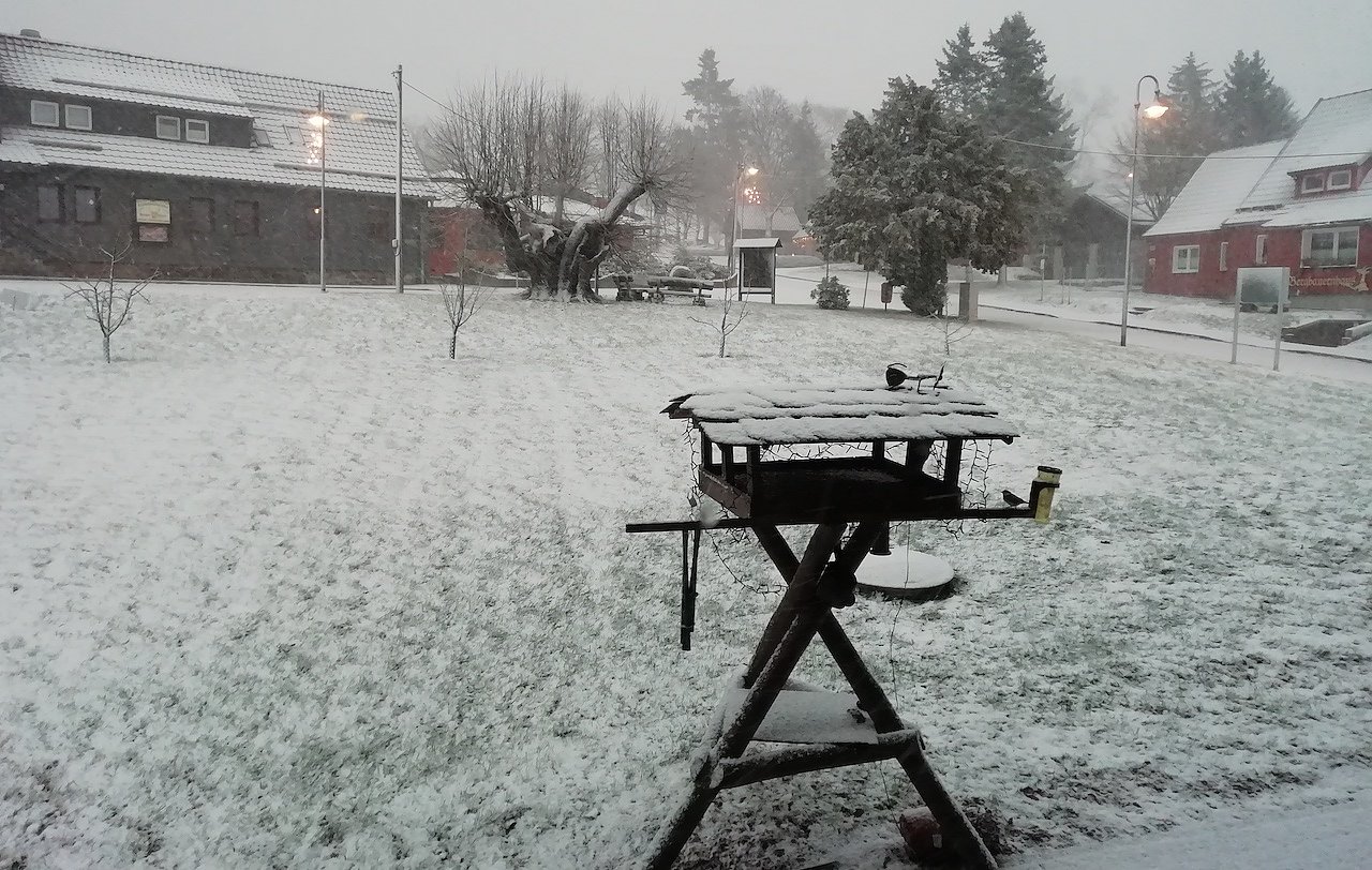 Sophienhof im Harz hofft auf weiße Weihnachten. Heute waren es am Morgen 0 Grad bei Wind und Schneefall. (Foto: W.Jörgens)