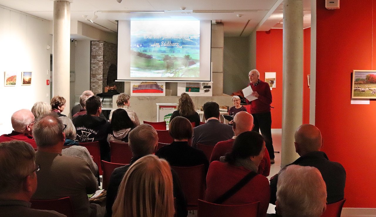 Der Abend fand seinen Ausklang in einem musikalisch-literarisch gestalteten Bildervortrag über Die vier Jahreszeiten im Südharz, dargeboten von Heinke und Rolf Richter. Das Ehepaar teilte seine Liebe zur Region in wundervollen Bildern mit einem interessierten Publikum, begleitet von Klaviersonaten von Franz Schubert und illustriert durch Auszüge aus den Monatsgedichten von Erich Kästner.