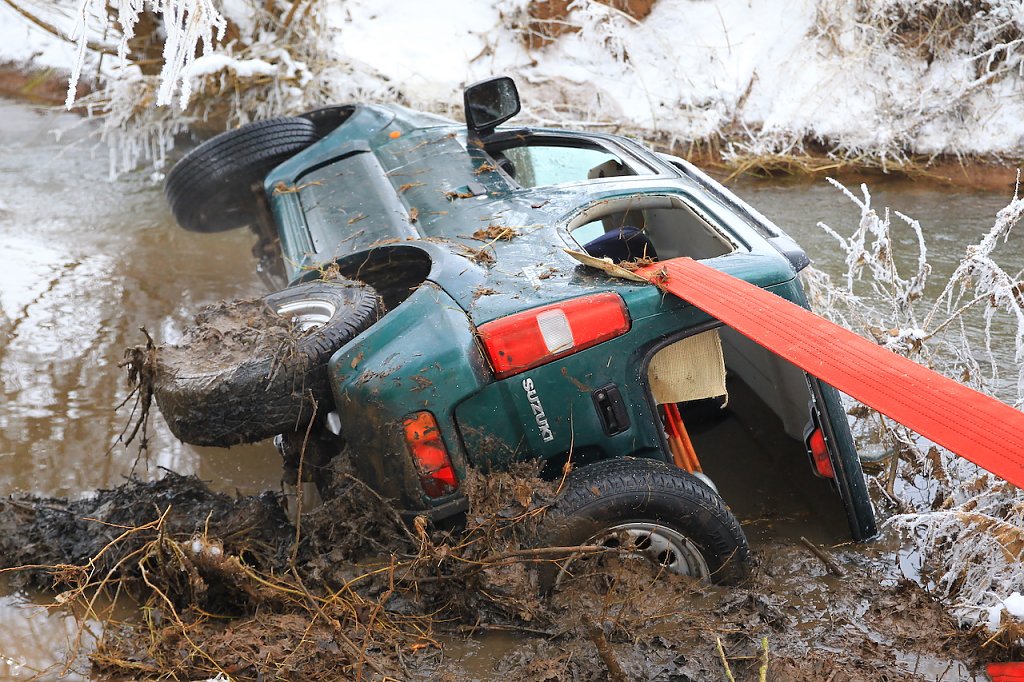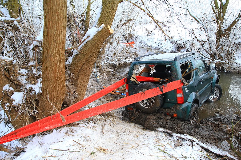 Immer standen die Helfer vor neuen Herausforderungen, die ein schnelles Handeln erforderlich machten. So vergingen rund zwei Stunden, bis sie das Fahrzeug erst einmal aus der Helme gezogen hatten. Danach ging es Stück für Stück weiter. Immer wieder mussten die Positionen der Rundschlingen und Umlenkrollen verändert werden, um ein erneutes Kippen oder Abrutschen des Fahrzeuges zu verhindern. Erst gegen 15.30 Uhr stand das gebogene Fahrzeug auf sicherem Terrain. Nun musste das ganze für die Bergung notwendige und verwendete Material wieder aufgenommen und verstaut werden.