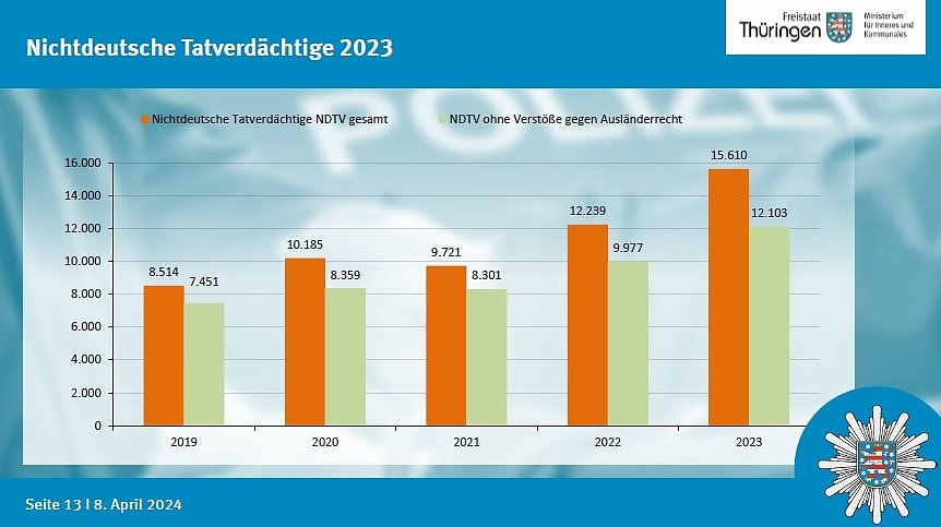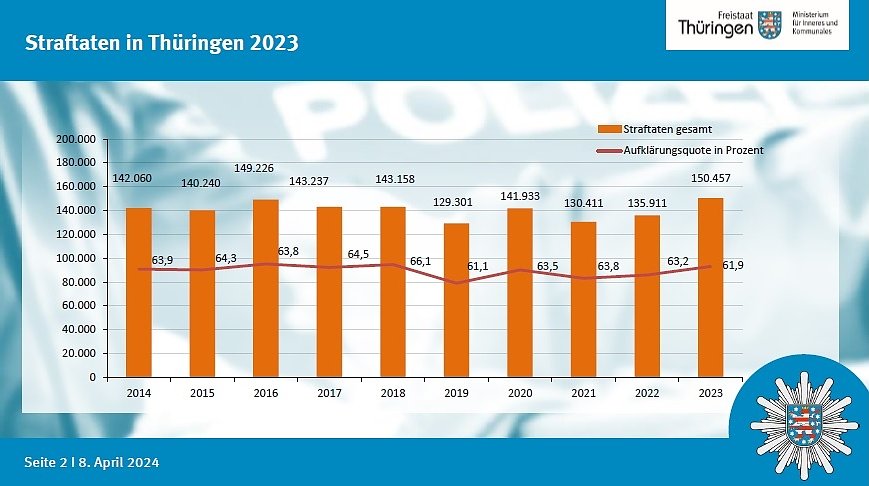 Heute stelle ich Ihnen Zahlen vor, die es in sich haben, sagte Innenminister Georg Maier zum Auftakt der Medienkonferenz. Was er meinte: Mit über 150.000 Straftaten gingen 2023 10,7 Prozent mehr Straftaten in die Polizeilichen Kriminalstatistik (PKS) ein als 2022. Wir haben die Einzelheiten...