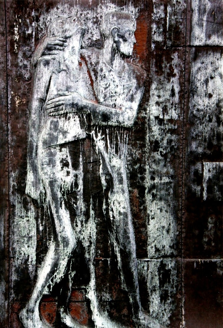 Als Heinz Scharr zu DDR-Zeiten den Auftrag bekam, für die Mahn- und Gedenkstätte Dora ein Kunstwerk zu schaffen, gab es dort vor dem Krematorium seit 1964 eine 5 Häftlinge umfassende Figurengruppe von Jürgen von Woyski (1929 - 2000). Etwa zur gleichen Zeit, als seine Kupferreliefwand fertig wurde, 1979, stellte man im Krematorium von Theo Balden (1904 - 1995) aus Bronze ein emporstrebendes Natursymbol einer Blüte auf als Sinnbild der Hoffnung.