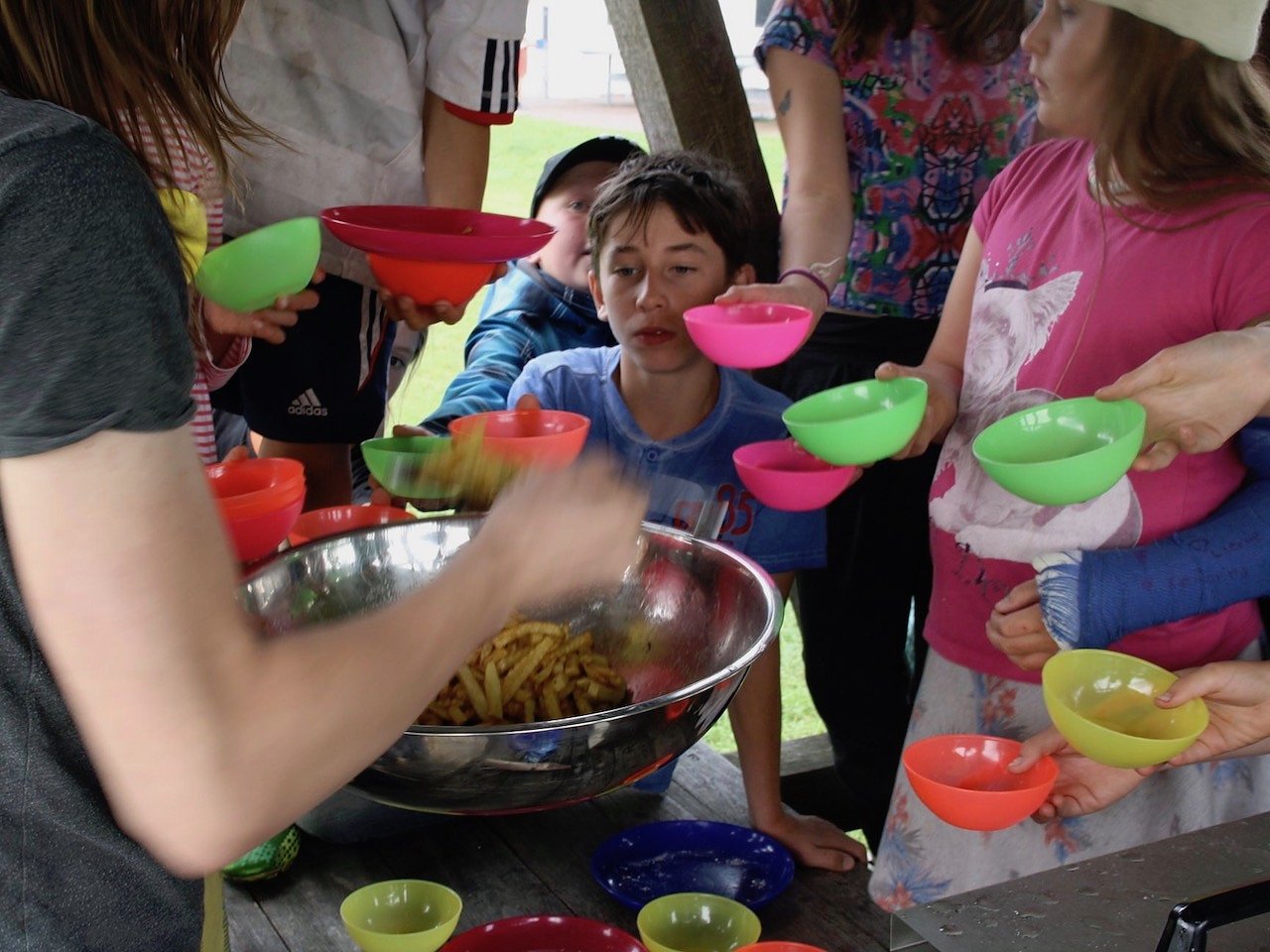 Nachdem die Kartoffeln gewaschen und geschält wurden, werden sie mit Spezialmessern in ihre typische geriffelte Stäbchenform gebracht, nochmal gewässert und mit einer Profi Fritteuse in heißem Fett frittiert. Abgerundet wird der knusprige Genuss mit Ketchup, Majo und wer mag mit Pommesgewürz. Zum Schluss kann dann jeder soviel davon futtern wie er schafft bzw. möchte.