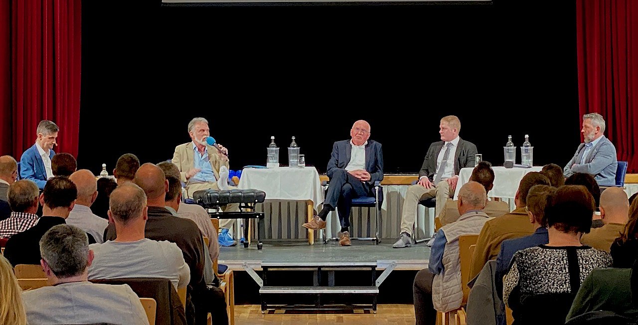 Podiumsdiskussion mit den Kandidaten der Landratswahl 2024 im KKZ in Bad Langensalza, v.li.n.re. amt. Landrat Harald Zanker (SPD); Hans Joachim Roth (CDU); Christopher Drößler (AfD); Thomas Ahke (Freie Wählergemeinschaft). Foto links außen Moderator Eric Marr (Foto: Eva Maria Wiegand)