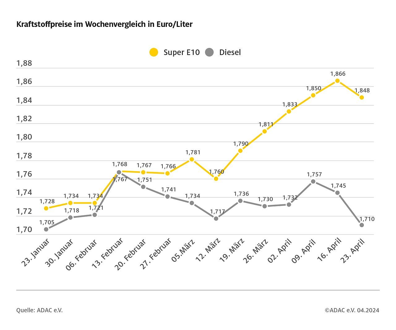Die Kraftstoffpreise haben gegenüber der Vorwoche spürbar nachgegeben, wie die aktuelle ADAC Auswertung des durchschnittlichen Benzin- und Dieselpreises in Deutschland zeigt. Danach kostet ein Liter Super E10 im bundesweiten Mittel derzeit 1,848 Euro und damit 1,8 Cent weniger als vor einer Woche...