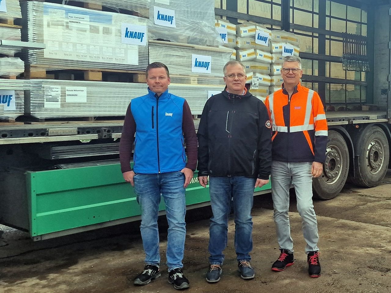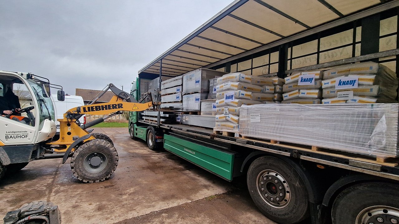 Es ist kurz nach 13 Uhr, auf dem Bauhofgelände der Landgemeinde Heringen herrscht regen Treiben. Dort ist gerade ein 40-Tonner der Spedition Ottfried Förster angekommen, der vollgepackt ist mit Knauf-Produkten.