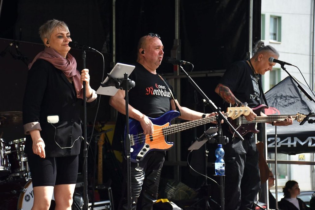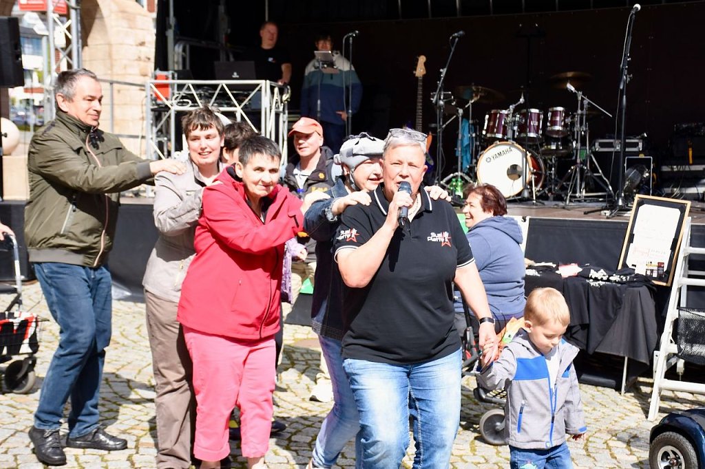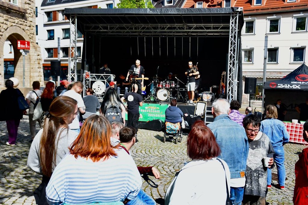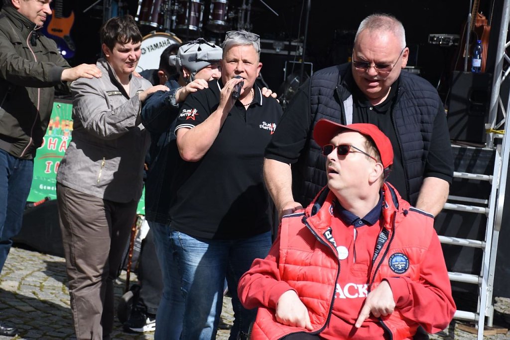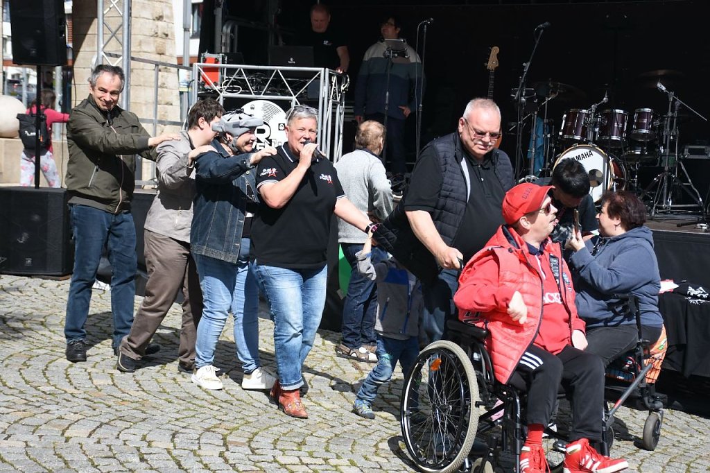 Der 6. Nordhäuser Inklusionstage des "VITT" fand heute als ein inklusives Fest und Protestaktion auf dem Nordhäuser Rathausplatz statt. Hier hatten sich auch einige Besucher eingefunden. Für das musikalische Bühnenprogramm sorgte die Bleicheröder Rockband Yoga. Für alle Partyschlagerfans heizten Susi Platte + DJ Steven H. den Gästen ordentlich ein.