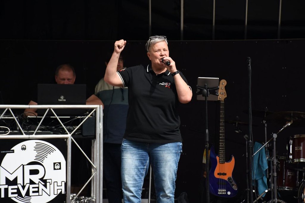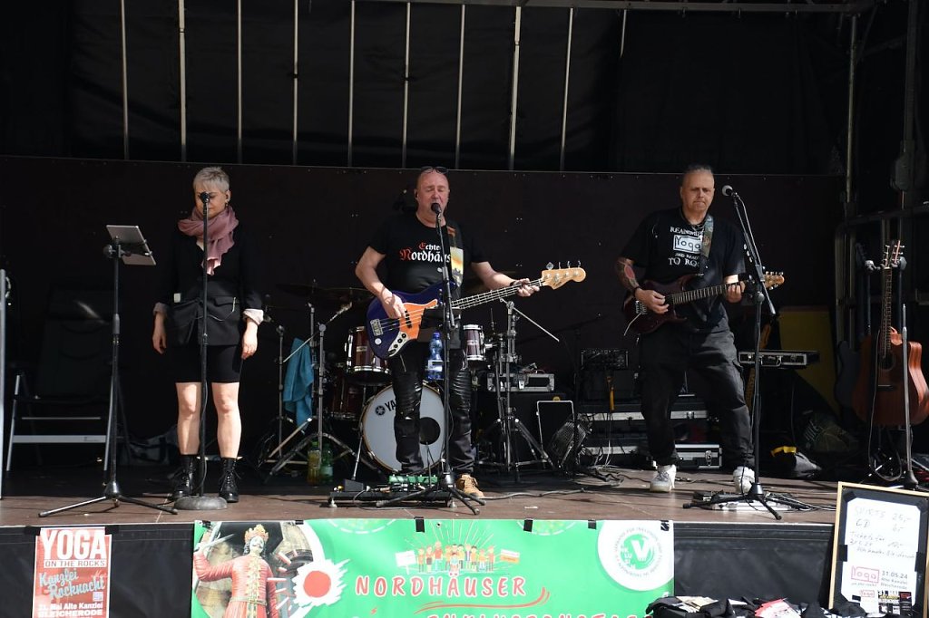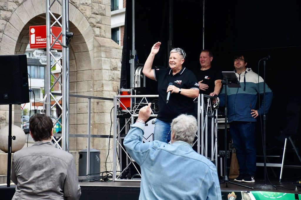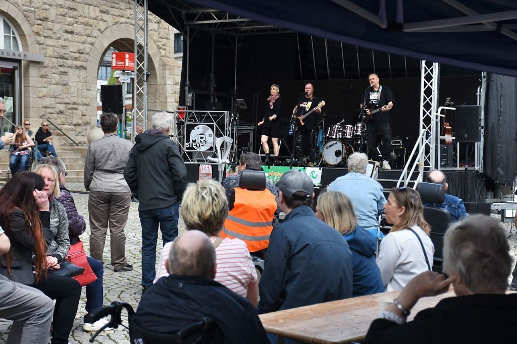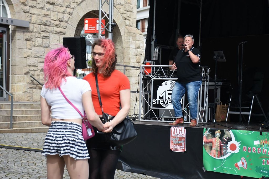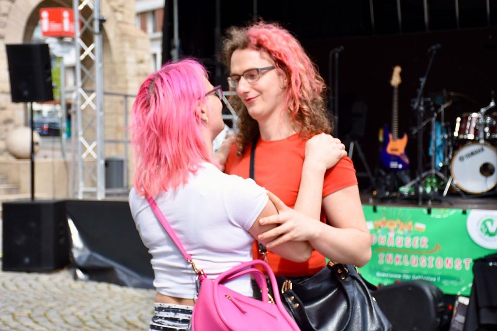 Der 6. Nordhäuser Inklusionstage des "VITT" fand heute als ein inklusives Fest und Protestaktion auf dem Nordhäuser Rathausplatz statt. Hier hatten sich auch einige Besucher eingefunden. Für das musikalische Bühnenprogramm sorgte die Bleicheröder Rockband Yoga. Für alle Partyschlagerfans heizten Susi Platte + DJ Steven H. den Gästen ordentlich ein.