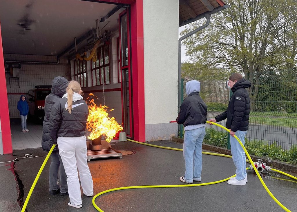 Wer einen Tag bei der Feuerwehr verbringt, der muss natürlich auch lernen, wie Brände gelöscht werden. Daher übten die 14 Schülerinnen an der letzten Station des Tages an einem Feuerlöschtrainer, wie man korrekt einen Kleinbrand bekämpft.