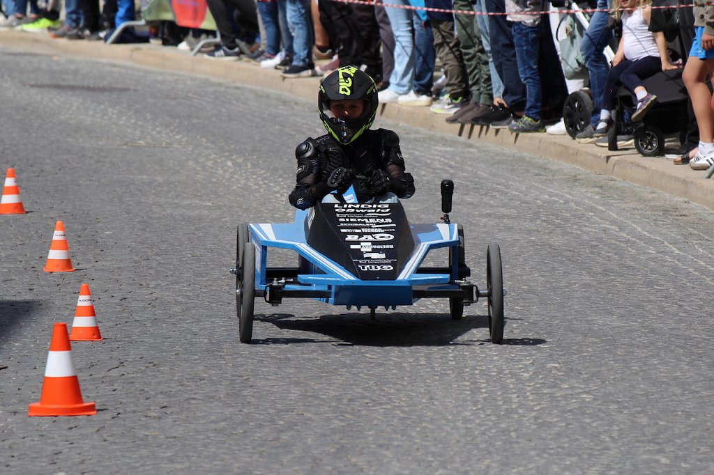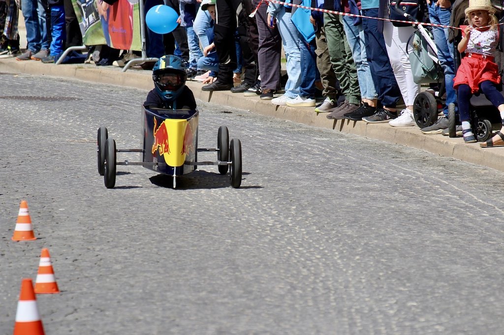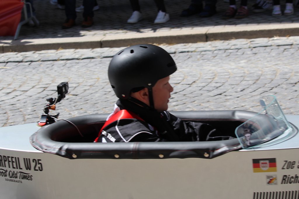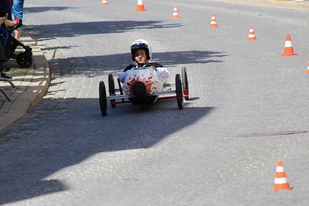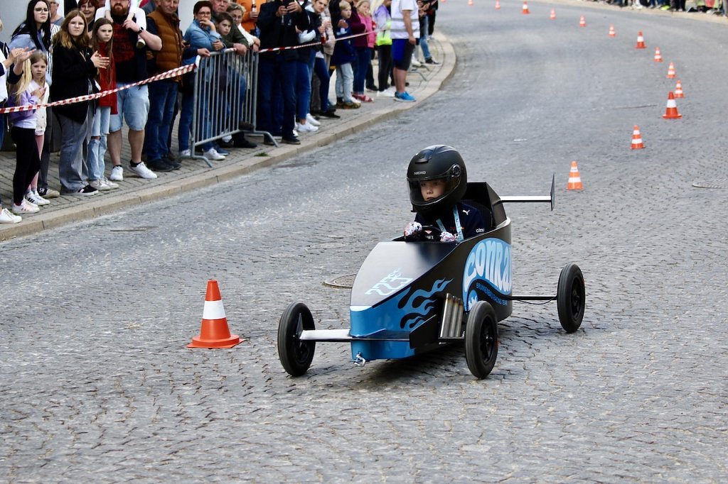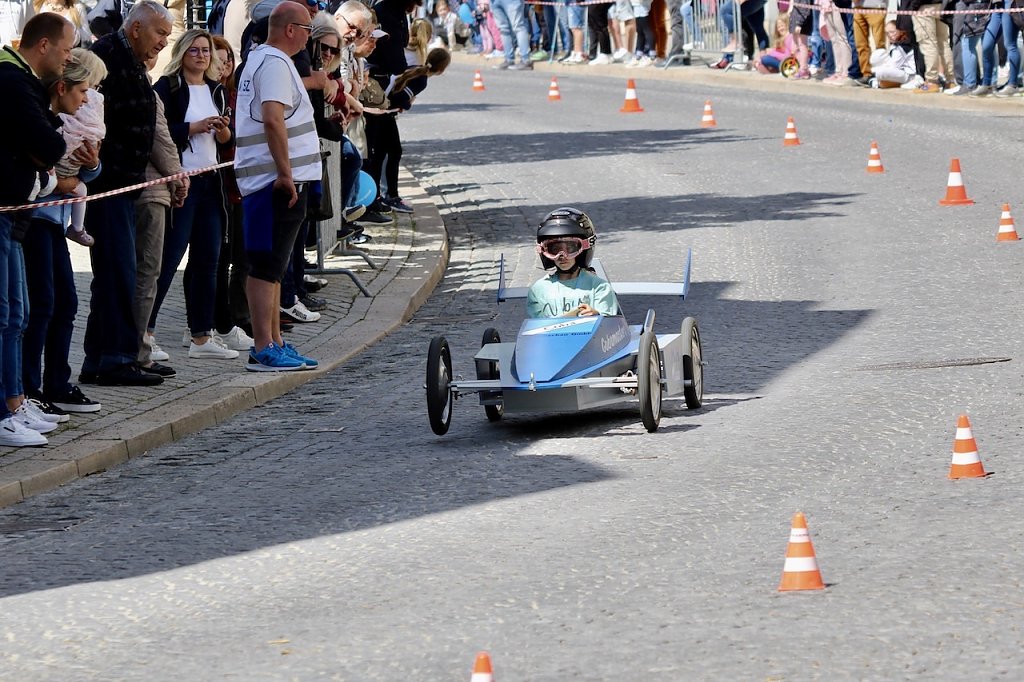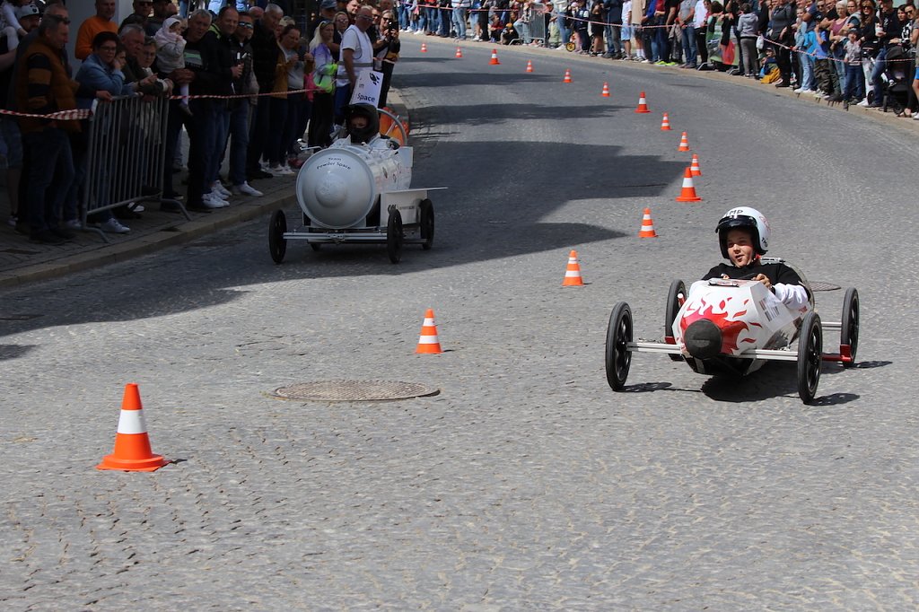 Dicht bevölkert war die Rennstrecke zwischen Kultur- und Kongresszentrum und dem Kriegerdenkmal heute Nachmittag, als das 2. Seifenkistenrennen der Kurstadt über das Kopfsteinpflaster ging. Ohne Crashs und mit viel Spaß und Sonnenschein …
