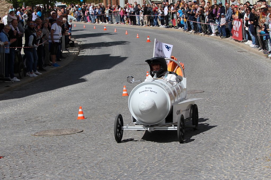 Die spannenden Läufe zum Junior-Cup brachten am Ende Entscheidungen im Zehntelsekundenbereich, was die Männer am Ziel aber durch die installierte elektronische Zeitmessung vor keinerlei Probleme stellte. Elektronisch ging es auch bei der Vermittlung des ausgefallensten und damit besten Gefährts im Freestyle-Fun-Wettbewerb zu, denn hier musste die zwischen den Händen erpresste und aus Hälsen geschrieene Luft der Zuschauer über den Sieger entscheiden. Mit einem Lärmpegel von 108 Dezibel konnte sich die Seifenkiste von GKN Sinter Metalls mit dem Starnamen Power Space als stylischstes Gefährt behaupten. Dicht gefolgt mit 106 Dezibel vom Zwiwel-Wagen.
