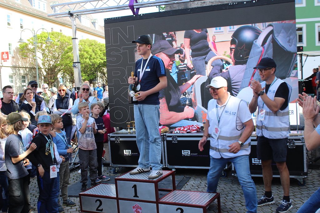 Der verantwortliche Organisator Mario König war froh und glücklich über den schönen Tag, der bei bestem Wetter und unglaublich engagiertem Publikum und Rennbeteiligten allen viel Spaß bereitete. Die eingesammelte Spendensumme von 500 Euro wird nun einem sozialen Zweck zugeführt werden. In zwei Jahren, so versprach er, gibt es eine Wiederholung. Moderator Hardy Krause hob in seinem Schlusswort hervor, dass solche Veranstaltungen bewiesen, dass durchaus etwas für junge Leute los sei in der Stadt. Die jungen Fahrer und ihre Kumpels an der Strecke werden dem Sportlehrer heute wohl nicht widersprechen.