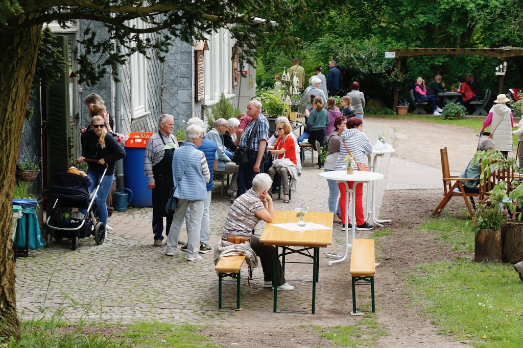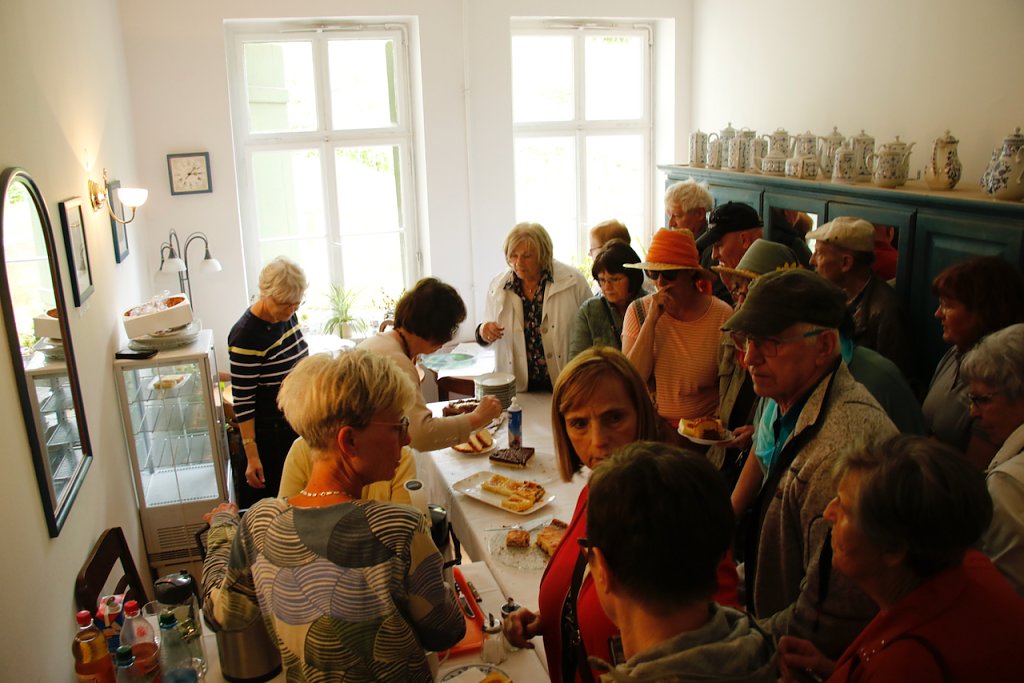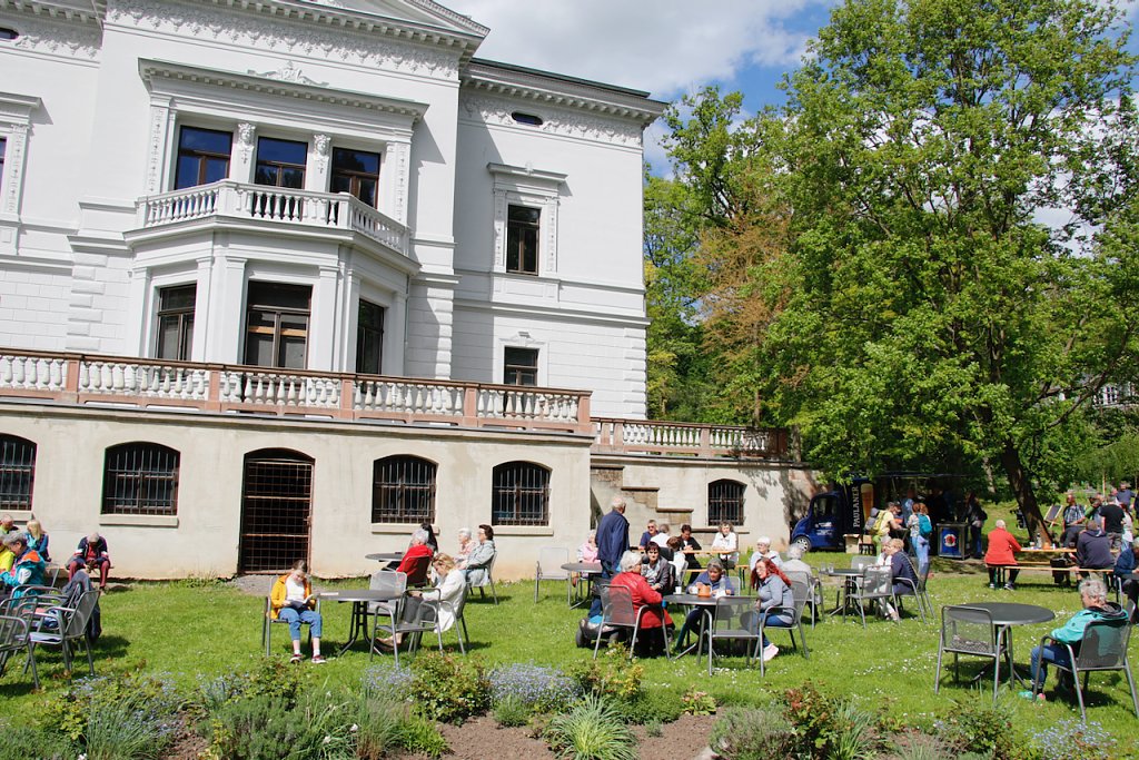 Vor der Villa und am Pavillon hatte die Stadt für musikalische Untermalung und manch andere Zerstreuung gesorgt, im Sonnenschein konnten man so entspannt schlemmen und die Seele baumeln lassen. Wer zwischendurch etwas mehr Bewegung brauchte, war im Pavillon bei Frau Witte zum Mitmachtanz geladen, oder konnte die alte Villa genauer in Augenschein nehmen. Für Pflanzenfreunde hatte Uschi Stark einen kleinen Marktstand aufgebaut.