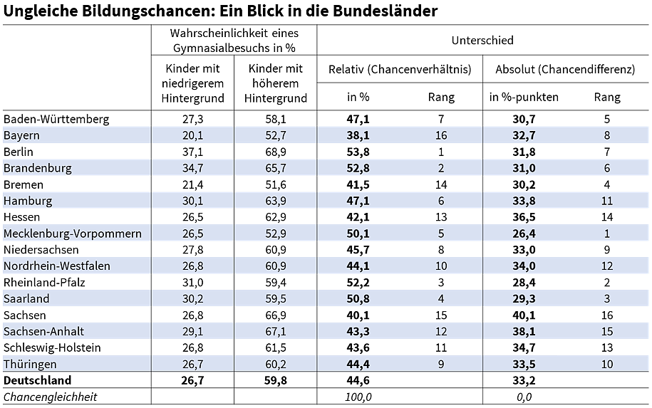 Die Studie vergleicht die Wahrscheinlichkeit eines Gymnasialbesuchs für Kinder aus benachteiligten Verhältnissen (weder ein Elternteil mit Abitur noch oberes Viertel der Haushaltseinkommen) mit der für Kinder aus günstigen Verhältnissen (mindestens ein Elternteil mit Abitur und/oder oberes Viertel der Haushaltseinkommen). Deutschlandweit besuchen 26,7 Prozent der Kinder aus benachteiligten Verhältnissen ein Gymnasium, aus günstigen Verhältnissen sind es 59,8 Prozent.