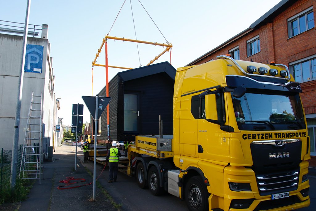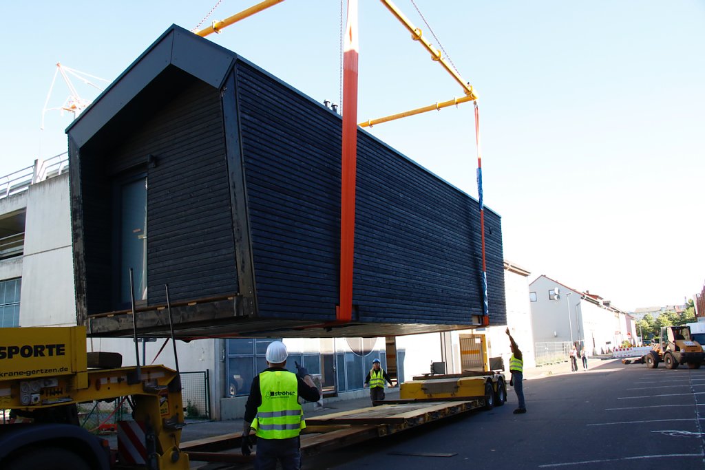Der Weg bis zur Umsetzung sei langsam und mühselig gewesen, berichtet Heck, sichtlich erleichtert. Gerade die letzte Etappe für die Anlieferung der Fertigbauten hätten ihm noch die letzten dunklen Haare auf dem Kopf geraubt. Eigentlich sollten die Häuser schon in der vergangenen Woche ankommen, dank bürokratischer Hürden wurde die Anlieferung mehrfach verschoben, mitunter in letzter Minute, der Kran stand schon vor über einer Woche vor dem Parkhaus und bis gestern Abend war nicht klar, ob es denn heute endlich klappen würde.