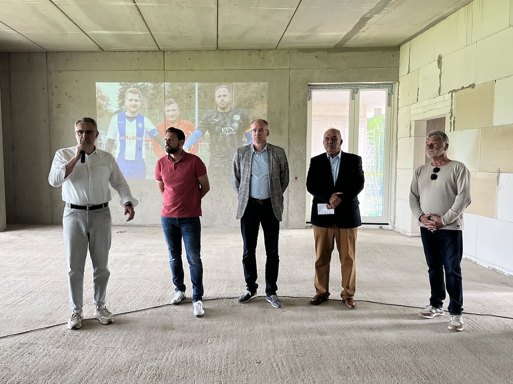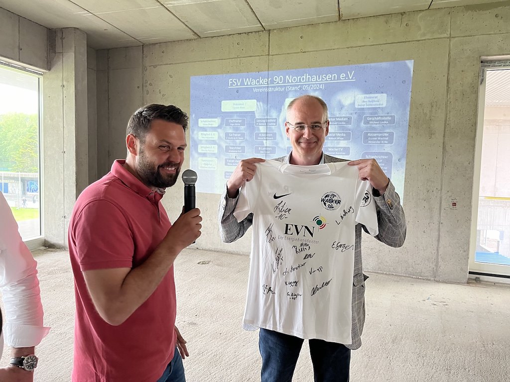 In der zukünftigen Lounge des Stadions im ersten Stockwerk des neuen Tribünengebäudes begrüßten Wacker-Präsident Torsten Klaus, KSB-Chef Gert Störmer sowie die Bauherren der Servicegesellschaft (Geschäftsführer Gunnar Reuter) und sein Chef, Landrat Matthias Jendricke die Gäste. Torsten Klaus betonte, dass er sich über die gute Zusammenarbeit mit der Service GmbH freue und den Albert-Kuntz-Sportpark gern auch für andere Feiern und Veranstaltungen offen halten möchte.