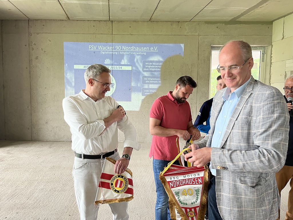 Zu besichtigen war heute schon ein schmuckes, helles Sozialgebäude, das im Sommer dann endgültig fertig wird.Nutzen werden es die vielen Nachwuchsmannschaften aus dem Landkreis Nordhausen, die in acht vorhandenen Umkleideräumen mit Duschanlagen und WC-Räumen ihr Domizil finden. Dazu kommen Räumlichkeiten für Trainer und Schiedsrichter. Rund 3, 3 Millionen Euro würden dafür aufgebracht, berichtete der Landrat, unter anderem eine Million Euro aus Bundesmitteln, die er zusätzlich von der Politik erwirkt hatte.