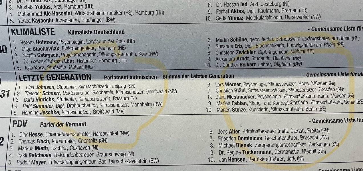 Die liberal-konservative Partei BÜNDNIS DEUTSCHLAND hat sich mit einem Schreiben vom 13. Mai 2024 an die Bundeswahlleiterin mit der Frage gewandt, warum den Kandidaten der "Letzten Generation" (Listenvorschlag 31) neben dem "Beruf oder Stand" (so wie es üblich ist bei den anderen Bewerbern) darüber hinaus die Bezeichnung "Klimaschützer" zugebilligt wurde und anderen Kandidaten nicht. Übersandt wurde auch der beigefügte Wahlzettel.