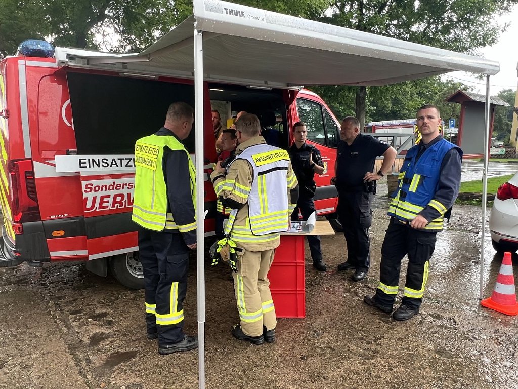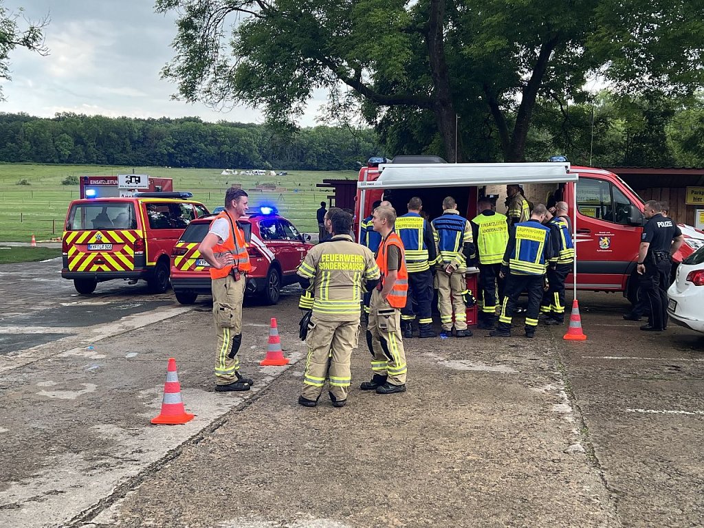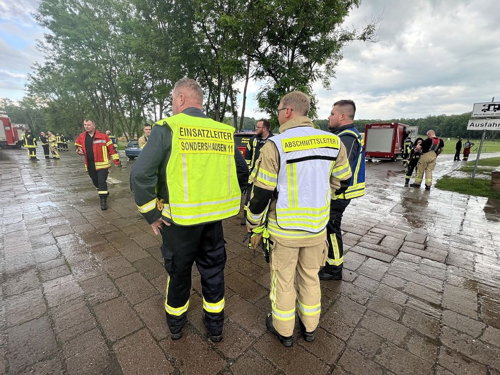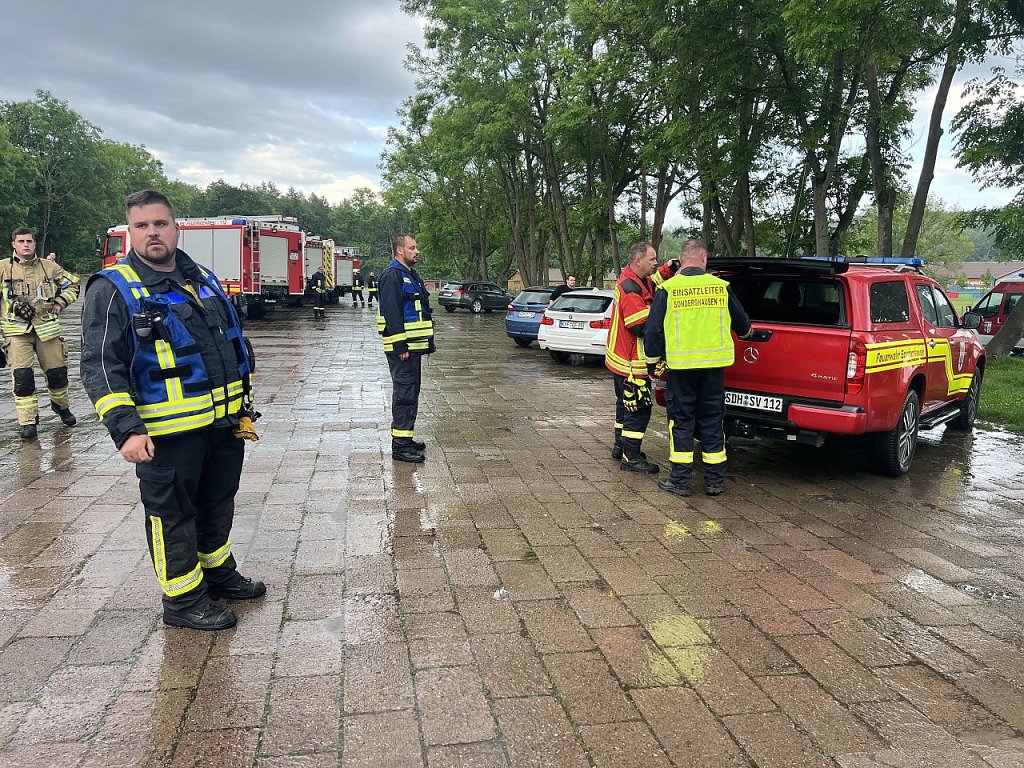 Auf dem Parkplatz am Possen koordiniert die Einsatzleitung den weiteren Ablauf der bevorstehenden Suche. Die Drohnenstaffel des Kyffhäuserkreises macht sich startklar, will das vordefinierte Suchgebiet mit der Wärmebildkamera abfliegen. Kaum ist die Drohne in der Luft, kommt über Funk die erlösende Meldung "Vermisste Person gefunden". Feuerwehrmann Christian K., welcher privat im Wald unterwegs war, fand die 90-jährige im Bereich der Mountainbikestrecke. Ein starker Regenschauer zieht über den Possenwald. Die ersten Feuerwehrleute eilen zur Fundstelle und leisten Hilfe.
