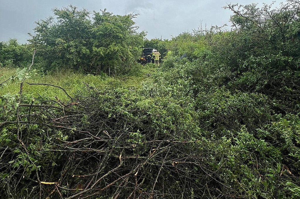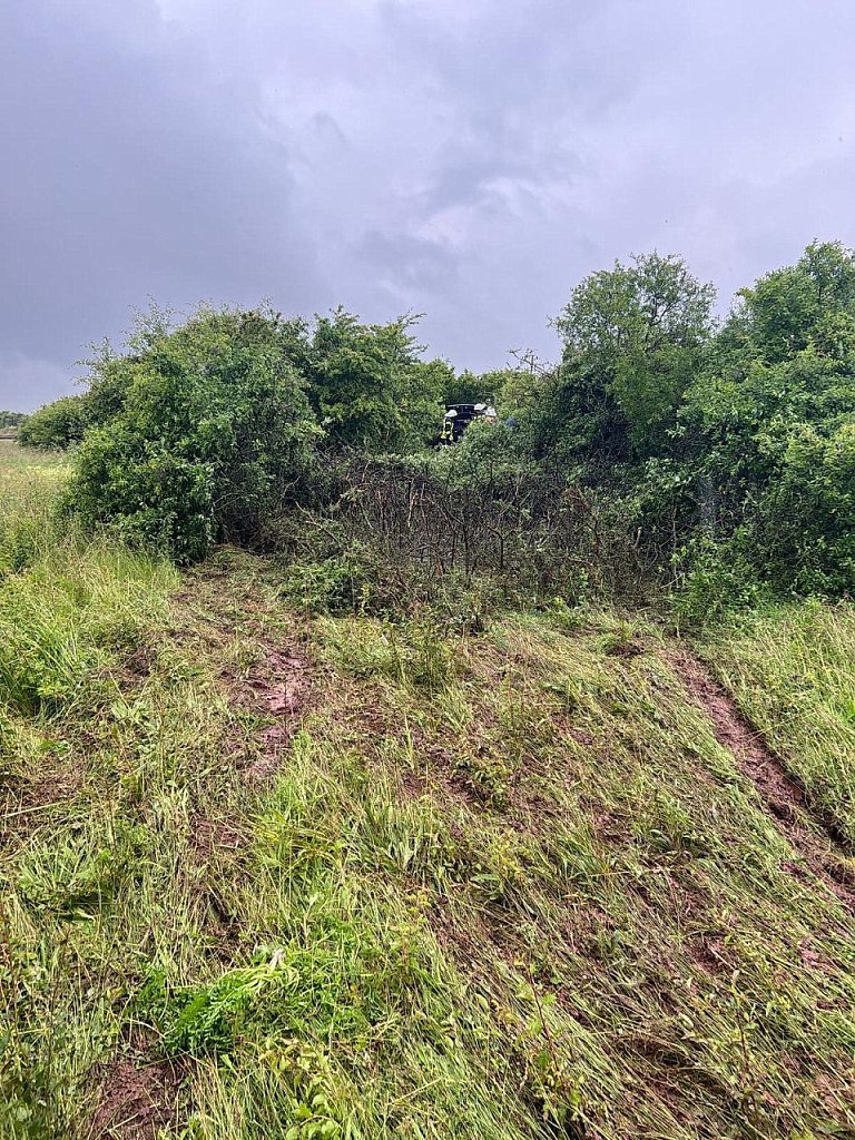 Hier kam der Mann mit seinem Fahrzeug auf Grund von Aquaplaning ins Schleudern und katapultierte über die Schutzplanke in der Autobahnabfahrt. Die Fahrt endete knapp 50 Meter später in einem Gebüsch.