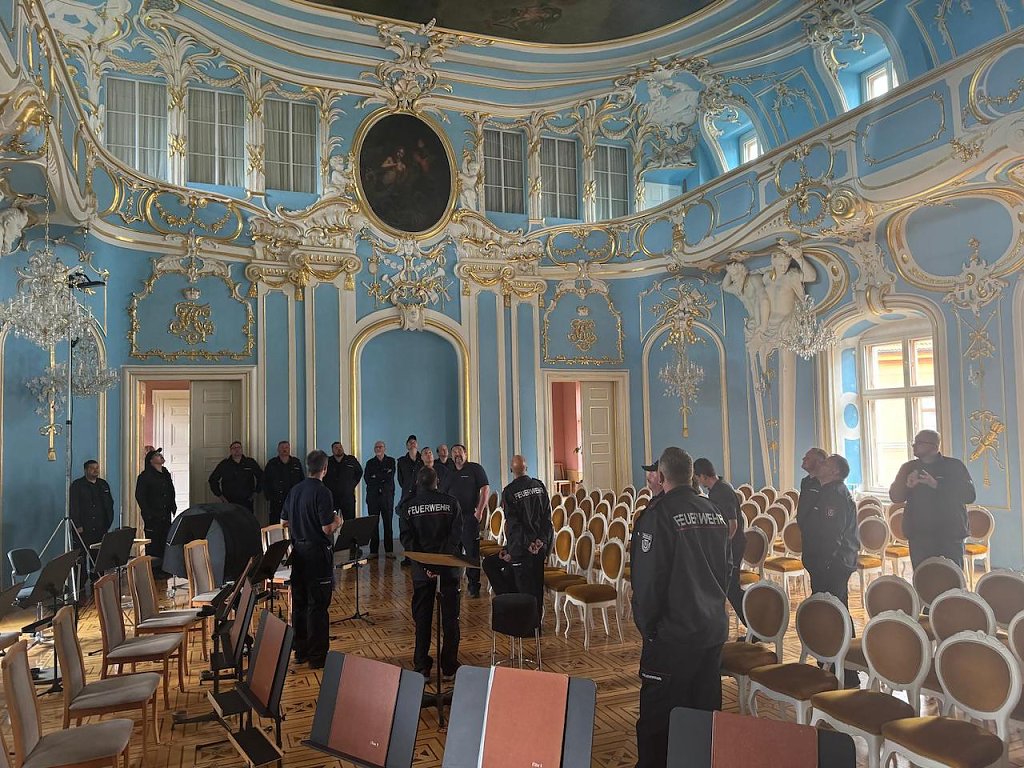 Bei der Schulung wurde ein Brand im Schloss simuliert – ein Katastrophenfall, der besonderer Vorbereitung und Wissen um die örtlichen Gegebenheiten bedarf, sagte Stadtbrandmeister Markus Pößel. Bei der Planübung sollten die Führungskräfte ausarbeiten, wie bei einem Brand im Schloss zu verfahren ist.