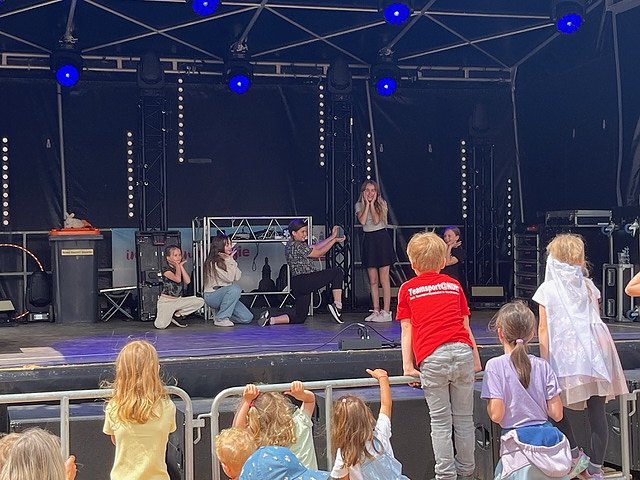 Eine schöne Mischung an Tänzen präsentierten die kleinen und großen Tanzschülerinnen und Tanzschüler um die Mittagszeit bei schönstem Wetter auf der Wiesen-Bühne. Klassische und moderne Tänze wurden gezeigt, begleitet mit einer liebevollen Moderation des bekannten und beliebten Märchenerzählers Axel, den treuen Zuschauern aus den traditionellen jährlichen Ballettmärchen-Aufführungen des Tanzstudios Radeva bekannt. Die Tanzeleven freuten sich über die große Aufmerksamkeit der vielen Festbesucher, auch die kleinen Kinderfest-Gäste wurden zum Mittanzen animiert.