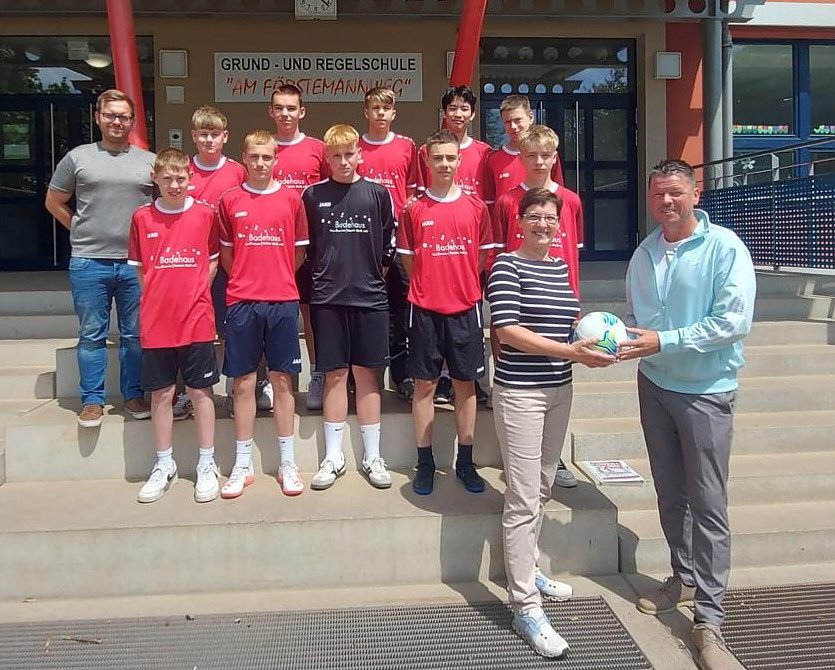 Mit ihrem Engagement rund um das Benefizturnier für ihren an Leukämie erkrankten Mitschüler Mika beeindruckten die Schülerinnen, Schüler und das Pädagogenteam Herrn Eisenschmidt. An diesem Tag waren die in die Jahre gekommenen Trikots der Schulkicker auch ein Thema. Hier bot das Badehausteam seine Unterstützung an und Schulleiterin Kirsten Schulze konnte mit den Jungen der neunten Klassen die neue Spielkleidung und einen Spielball in Empfang nehmen.