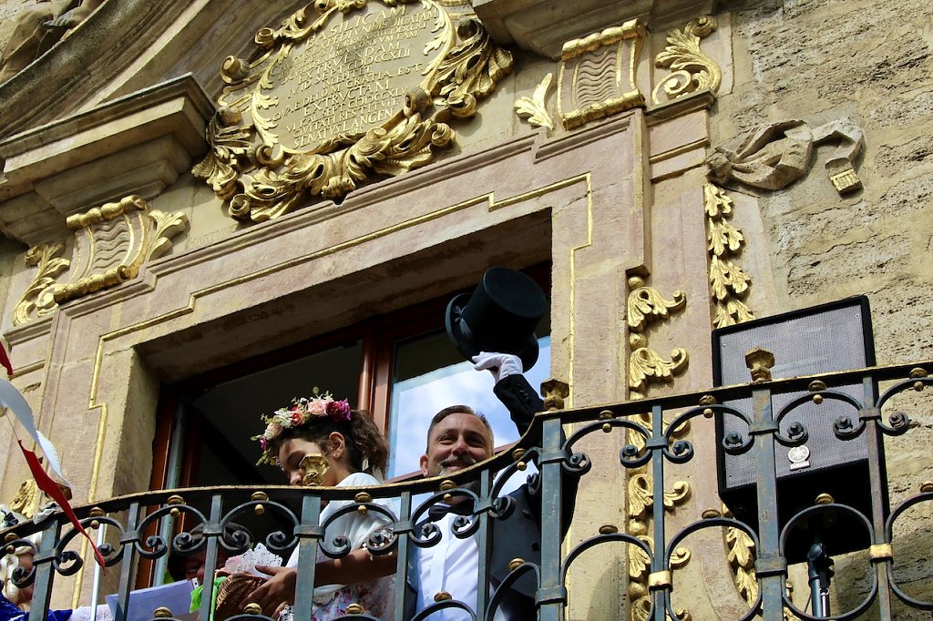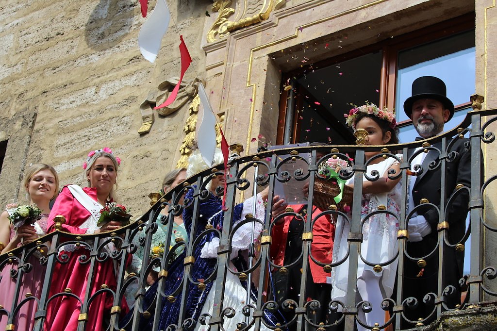 Dort legten sie Blumen zum Auftakt des Brunnenfestes nieder und machten sich anschließend in einem langen, fröhlich bunten Zug auf zum Rathaus der Stadt.