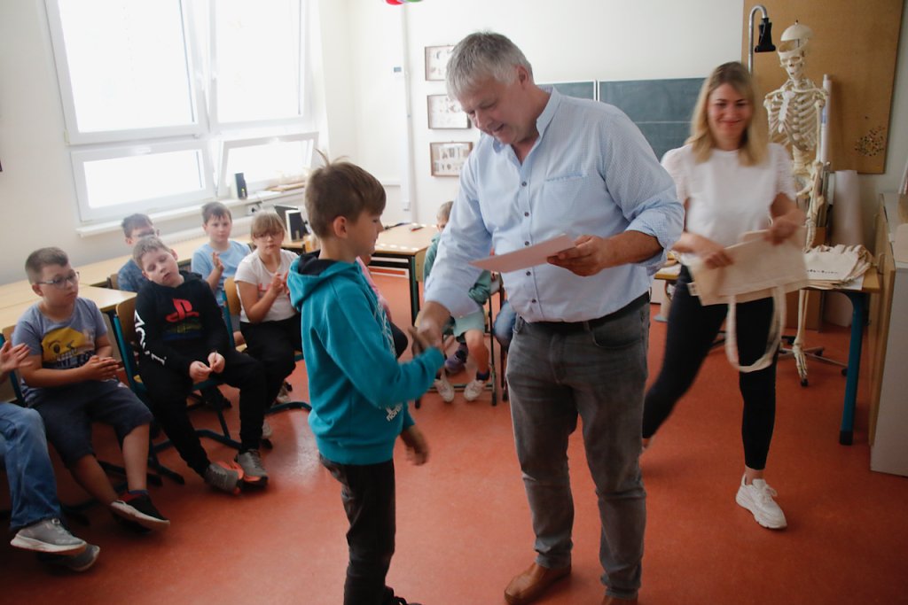 Ein großes Lob gab es auch von Schulleiter Jörg Lorenz, der die kleinen Gärtnern heute mit Urkunden aus dem Hause von Bundeslandwirtschaftsminister Cem Özdemir auszeichnen durfte. Neben ein paar kleinen Präsenten gab es dazu auch eine weitere Überraschung: einen Scheck in Höhe von 450 Euro für die Klassenkasse. Was man damit macht? Wahrscheinlich etwas für den Schulgarten.