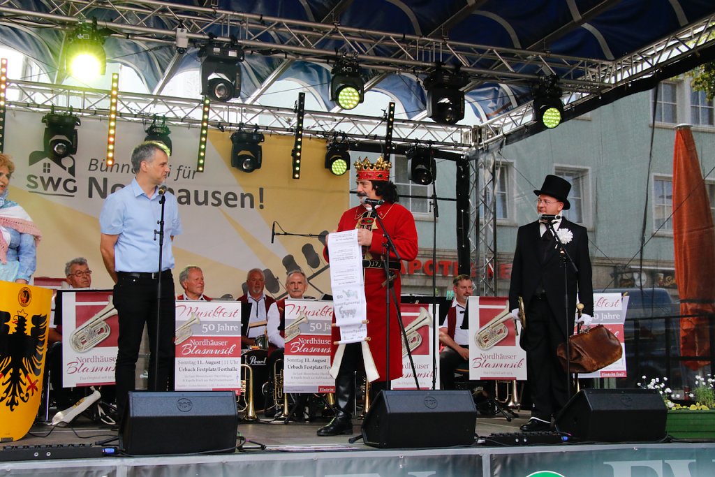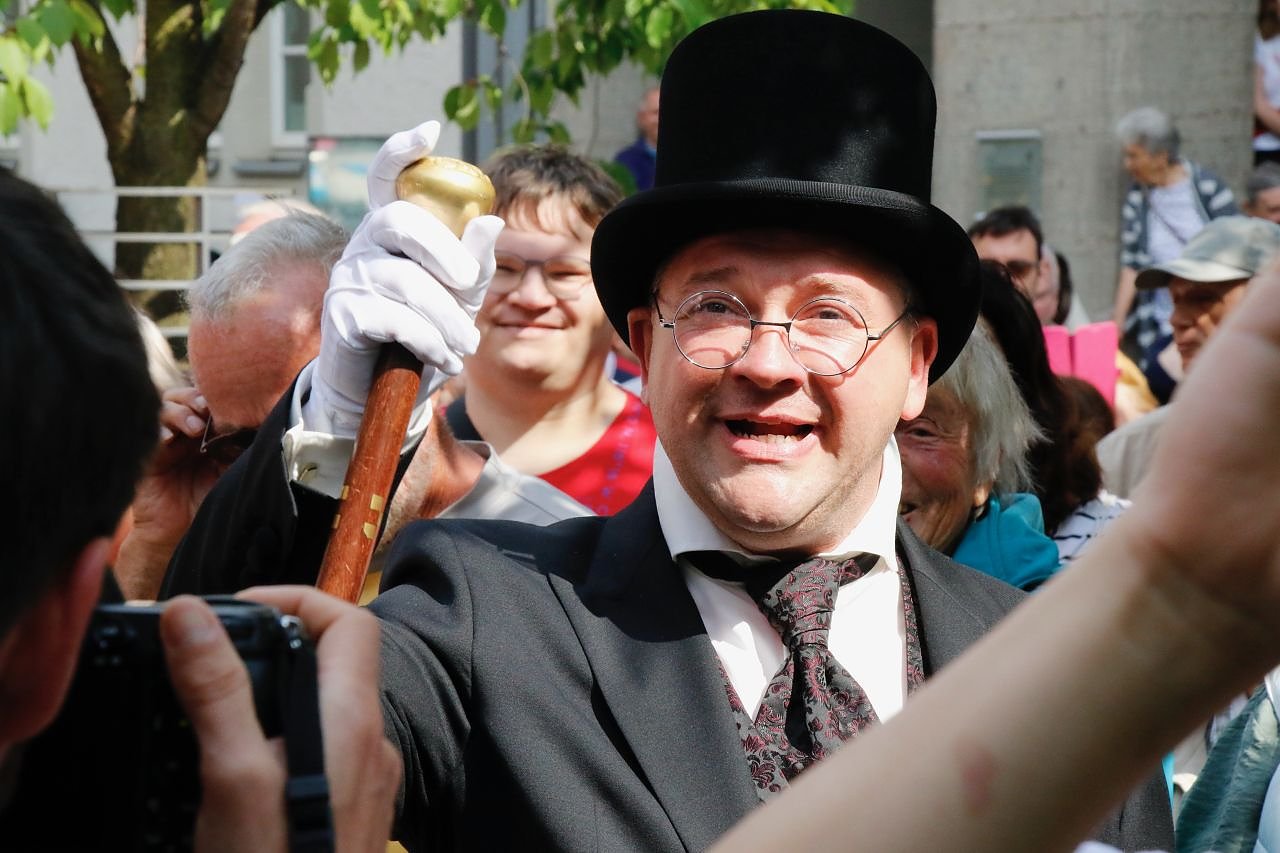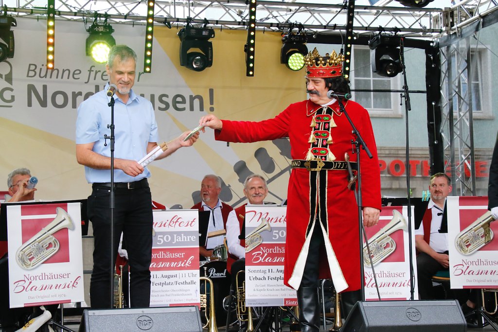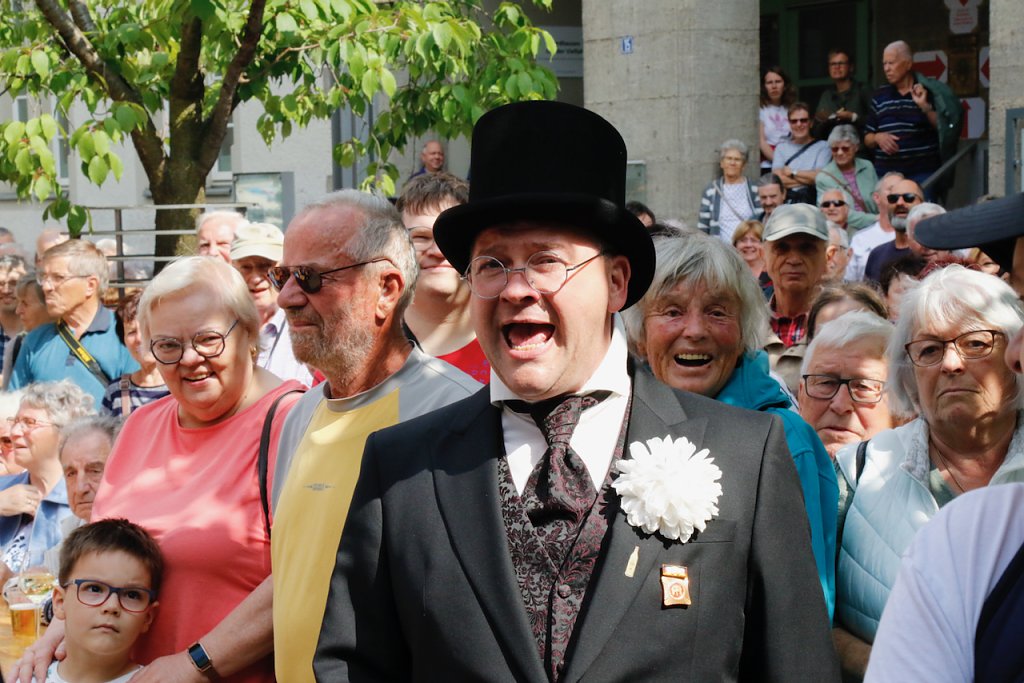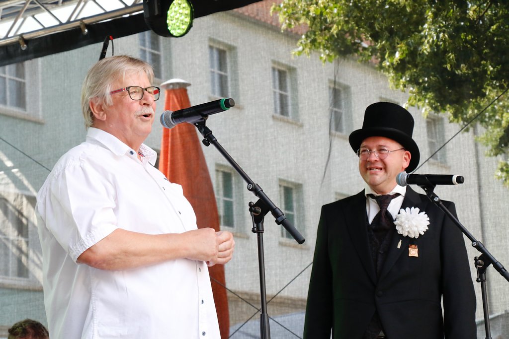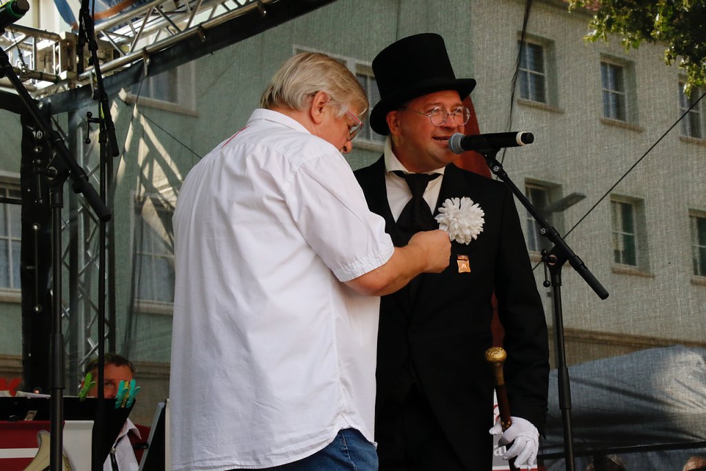 Bevor der Professor sich dem Blasorchester zuwandte gab es noch einen letzten Akt zu vollziehen: Amtsvorgänger Winfried Schmidt schickte sich an, den neuen im Zwanziger Zwirn, Thomas Müller, zu dessen Einstand das allzu blanke Revers mit einem Orden zu schmücken. Nach vollzogener Amtshandlung wurde wieder aufgespielt, das 54. Rolandsfest ist eröffnet.