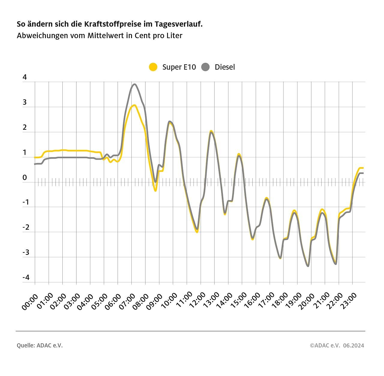 Die täglichen Preiskurven der beiden Sorten verlaufen weitgehend parallel, auch wenn die morgendliche Preisspitze bei Diesel etwas stärker ausgeprägt ist als bei Benzin. Insgesamt ergibt die Analyse des ADAC im Tagesverlauf acht Preisspitzen – sieben waren es noch im vergangenen Jahr.