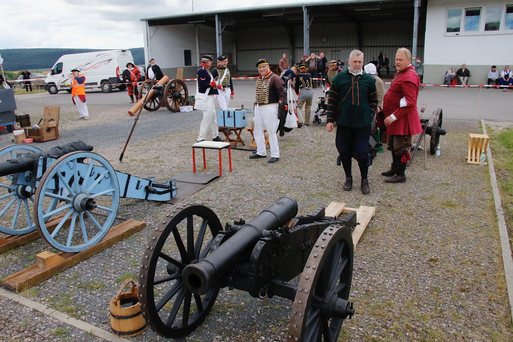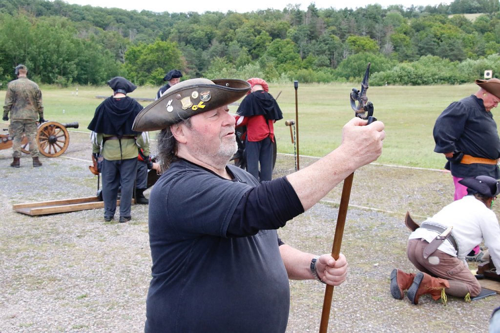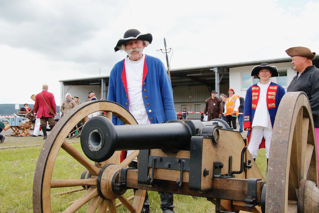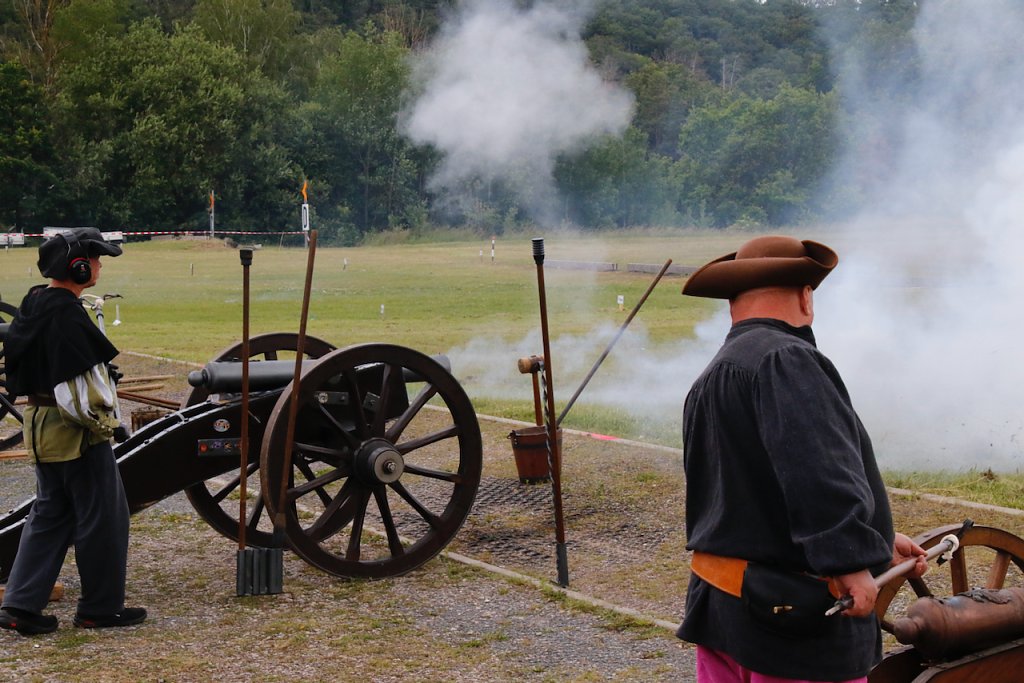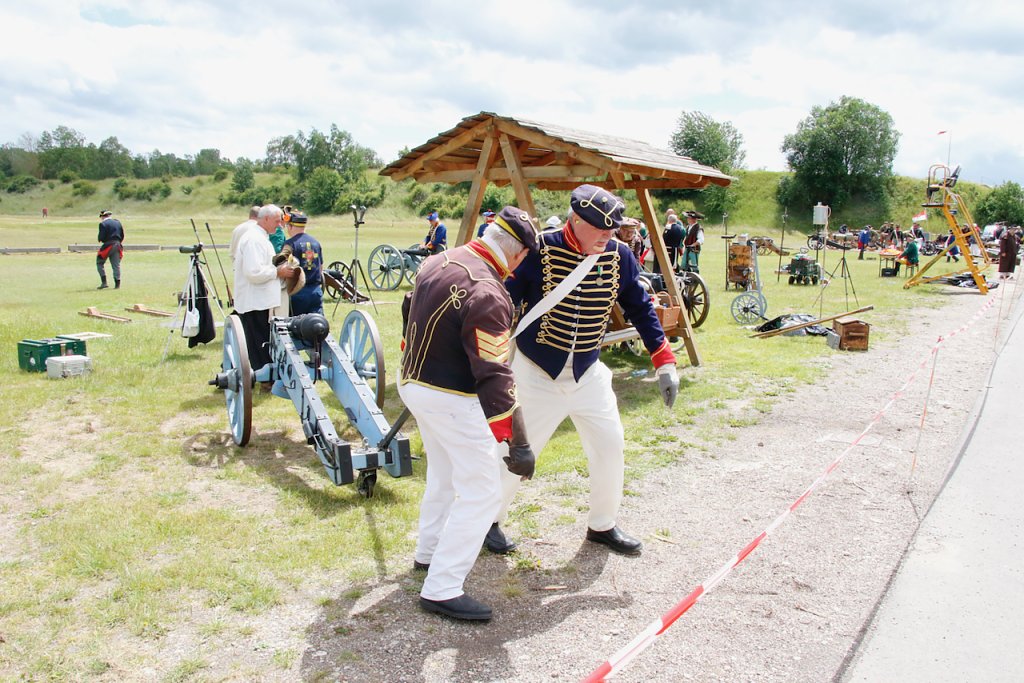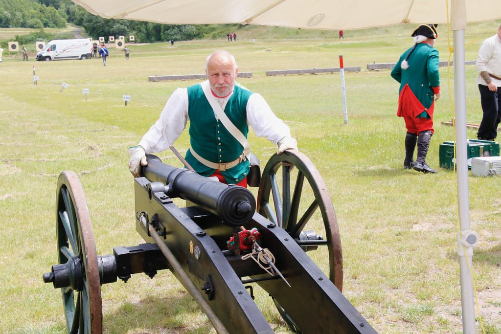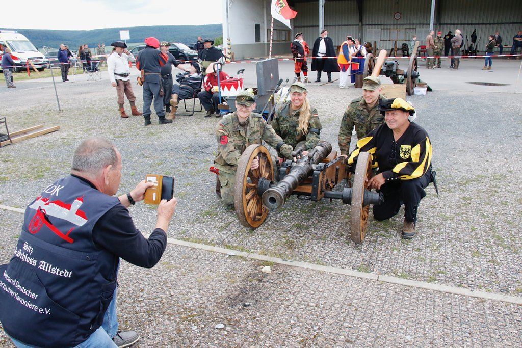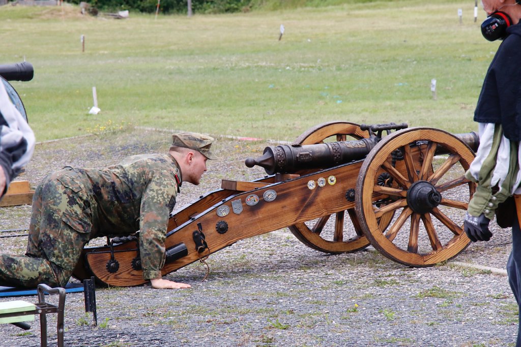 Mit dabei war auch Albrecht Uhlmann und sein Nordhäuser "Lindwurm", ein Nachbau des alten Stadtgeschützes, das die Altvorderen zu den "Sieben Wundern" Nordhausens zählten. Uhlmann stellt die Visierung heute aber nicht selber ein, er lässt schießen. An der alten Kanone stehen Raphael, Verena und Lukas, jeder im Range des Oberstleutnants. Die Artillerieschützen aus Munster müssen sonst Ziele treffen, die bis zu 30 Kilometer entfernt liegen, heute liegt die maximale Entfernung der Zielscheiben nur bei 400 Metern.