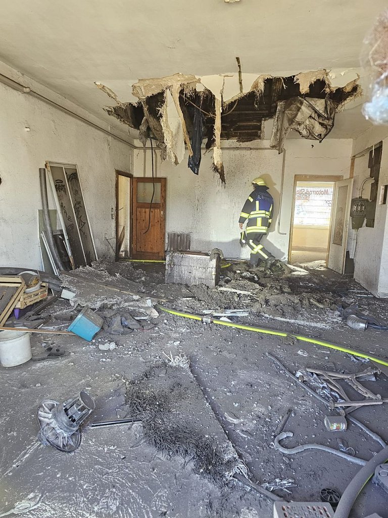 Am heutigen Samstag gab es dann wieder einen Einsatz am selben Objekt. Ein Déjà-vu für die Einsatzkräfte. Dieses Mal brannte es im Dachbereich. Durch ein bereits in der Decke befindliches Loch wurde ein Holzbalken in Brand gesetzt.
