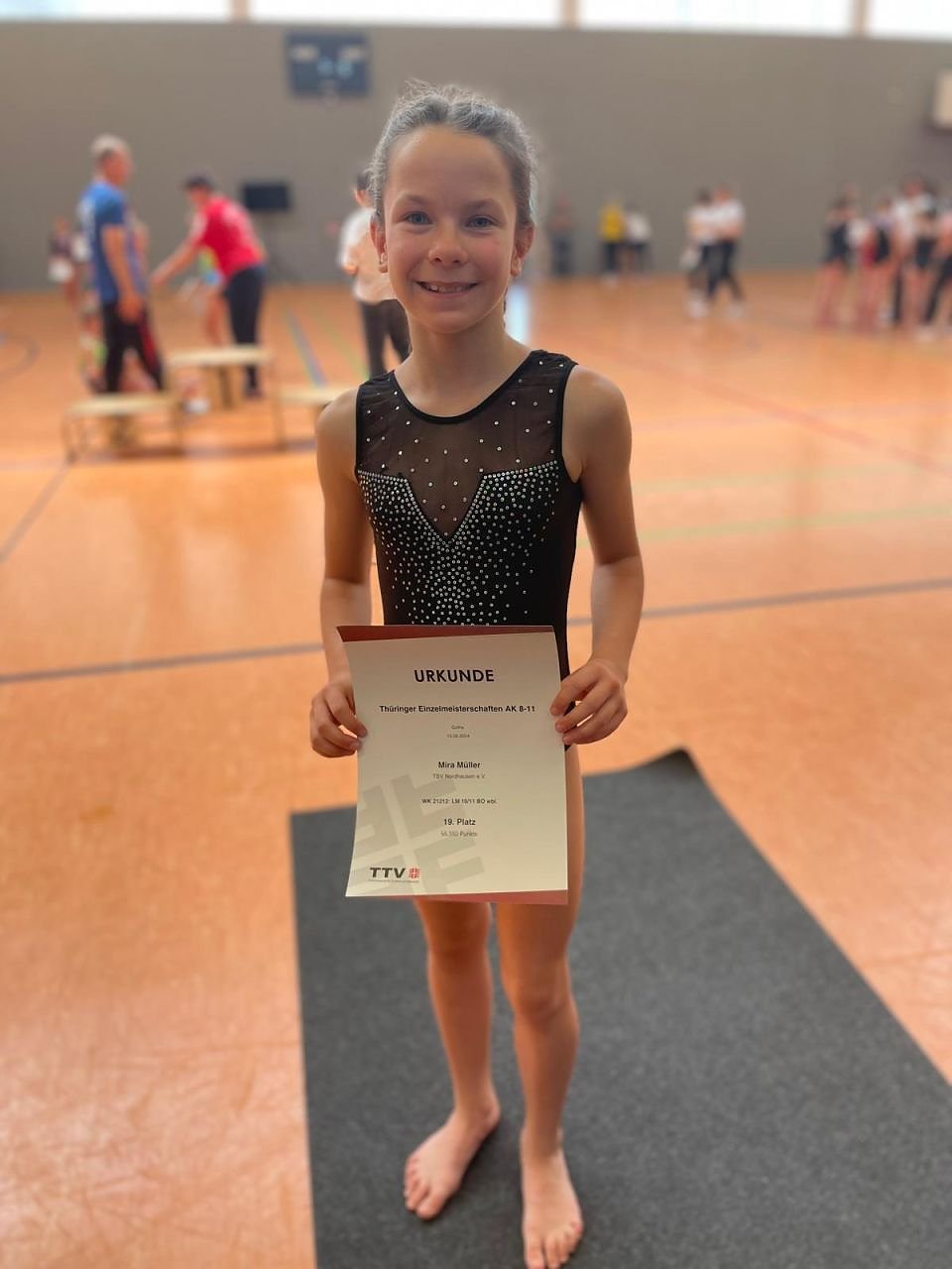 Vergangenen Samstag war es dann so weit, die besten Turnerinnen aus ganz Thüringen in den Altersklassen 8/9 und 10/11 trafen sich in Gotha. Die Aufregung war sehr groß, denn es war ihr erster großer Wettkampf vor dieser Kulisse. Amy Krömer, Mathea Feitsch (AK 8/9) und Mira Müller (AK10/11) wollten zeigen was sie in den letzten Wochen geübt haben und sich den kritischen Augen der Kampfrichter stellen.