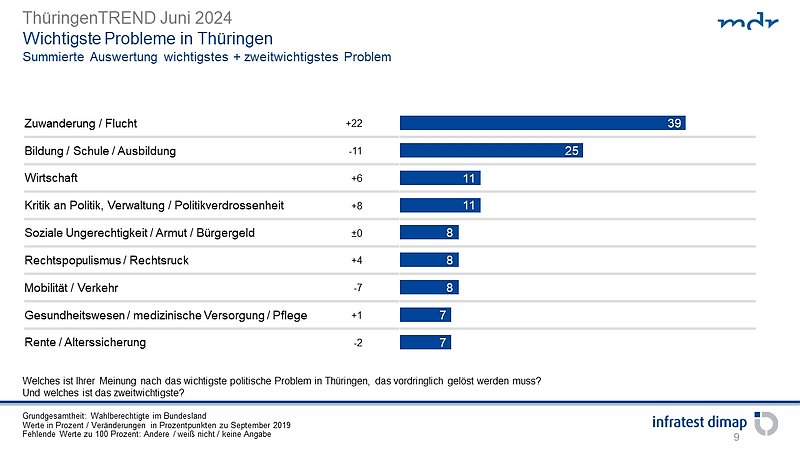 Die aktuelle Problemagenda der Thüringer unterscheidet sich deutlich von der vor fünf Jahren. War die Problemsicht der Wahlberechtigten damals vor allem von Schul- und Bildungsthemen geprägt, stehen bei ihnen gegenwärtig Migrationsfragen an erster Stelle. 39 Prozent (+22) und damit wesentlich mehr als zur letzten Landtagswahl sehen in der Zuwanderung die derzeit größte landespolitische Herausforderung, für 25 Prozent (-11) ist die Landespolitik primär in der Bildungspolitik gefordert.