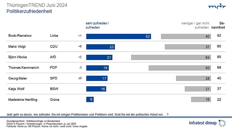 FDP-Fraktionschef und Kurzzeitministerpräsident Thomas Kemmerich erhält von knapp jedem Fünften Zuspruch (18:50 Prozent). Ähnliches gilt für den stellvertretenden Ministerpräsidenten und Innenminister Georg Maier (17:28 Prozent). Zur BSW-Spitzenkandidatin Katja Wolf äußern sich 16 Prozent zufrieden, einer Mehrheit ist die Eisenacher Oberbürgermeisterin und frühere Linken-Politikerin jedoch kein Begriff. Madeleine Henfling, Spitzenkandidatin der Grünen, erzielt nicht zuletzt aufgrund sehr geringer Bekanntheit den geringsten Zuspruch (6 Prozent).