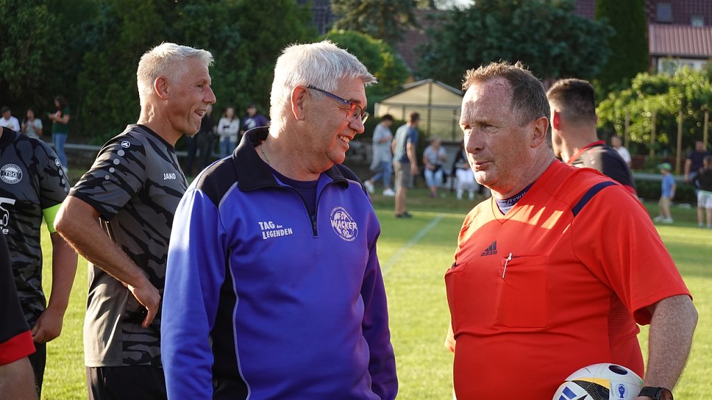 Einen Ehrenanstoß führten FIFA-Schiedsrichter-Legende Adolf Prokop, Ex-Wacker-Trainer Klaus-Dieter Koschlick und Volker Vogt "erfolgreich" aus (siehe Video).