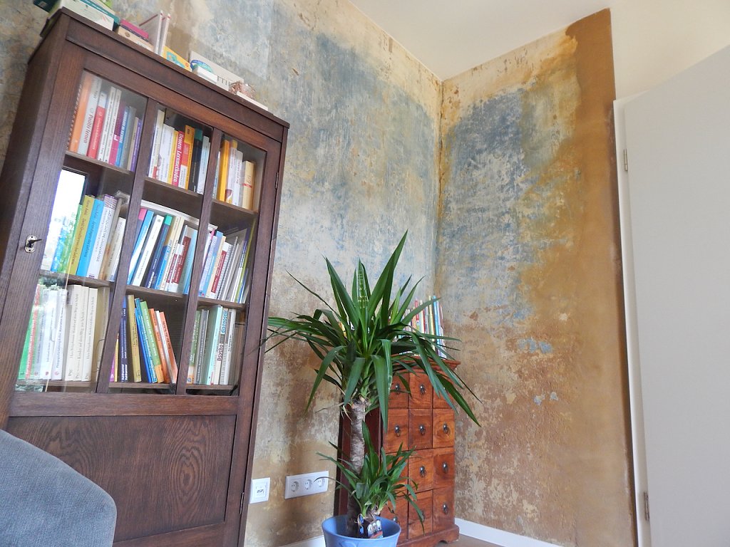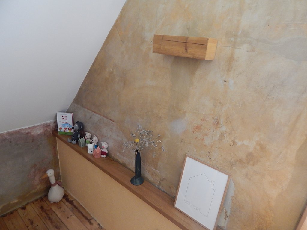 Zweiter wichtiger Aspekt, der auch Bauherrin Eisfeld am Herzen lag, war die Nachhaltigkeit und die Verbindung zur Geschichte des Hauses. An manchen Stellen hat man die Spuren der Zeit deswegen bewusst nicht verdeckt und Zeitfenster gelassen und wo sich Baumaterial erhalten ließ, wurde es auch weiter genutzt. Schritt drei und vier waren die Farbauswahl, die im Dienste des therapeutischen Ansatzes stehen sollte, sowie die Aufteilung der Räumlichkeiten, die sowohl den Kindern wie auch Eltern und, bei öffentlichen Veranstaltungen, auch den Bedürfnissen eines breiteren Publikums gerecht werden müssen. Man soll sich hier wohlfühlen können, Inne halten und die Ruhe, die dieser Ort bietet, in sich aufnehmen. Wir haben hier Kinder mit Lese-Rechtschreib-Schwäche, Dyskalkulie, Aufmerksamkeitsstörungen und ähnlichem. Wenn solche Hürden nicht früh bemerkt werden, kommt man in der Schule schnell in eine Abwärtsspirale, die den Kindern schwer zusetzt. Die Naturnähe war uns deswegen wichtig, weil wir keine klassische Nachhilfe leisten, sondern einen ganzheitlicher Ansatz verfolgen, der den Kindern helfen soll sich zu erden und so stressfrei zu Strategien zu kommen, mit denen sie Lernschwierigkeiten begegnen können. Darüber führen wie sie dann gemeinsam wieder an den Stand ihrer Klassen heran, vor allem für die Grundfertigkeiten Lesen, Schreiben und Rechnen, erklärt Eisfeld.