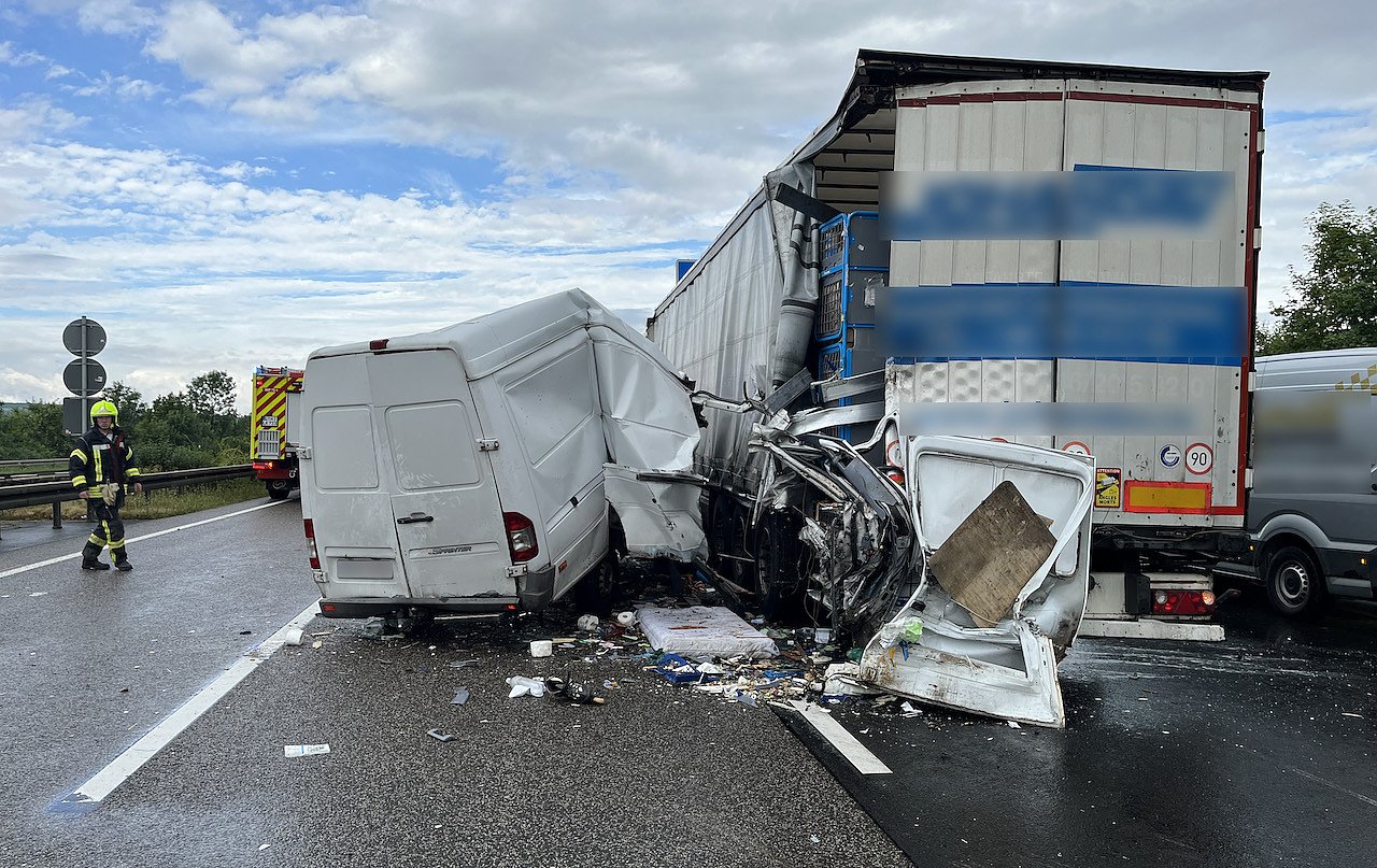 Aus bisher ungeklärter Ursache übersieht die 51-jährige polnische Fahrzeugführerin eines Sprinters das Stauende und kollidierte trotz Ausweichmanöver mit dem Heck des Sattelzuges. Wie durch ein Wunder verletzte sich die Frau nur leicht. Sie wurde in ein umliegendes Krankenhaus verbracht. Der Fahrer des Sattelzuges blieb unverletzt.