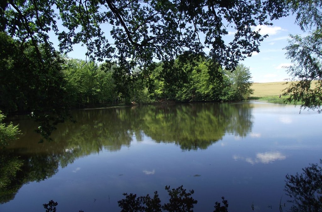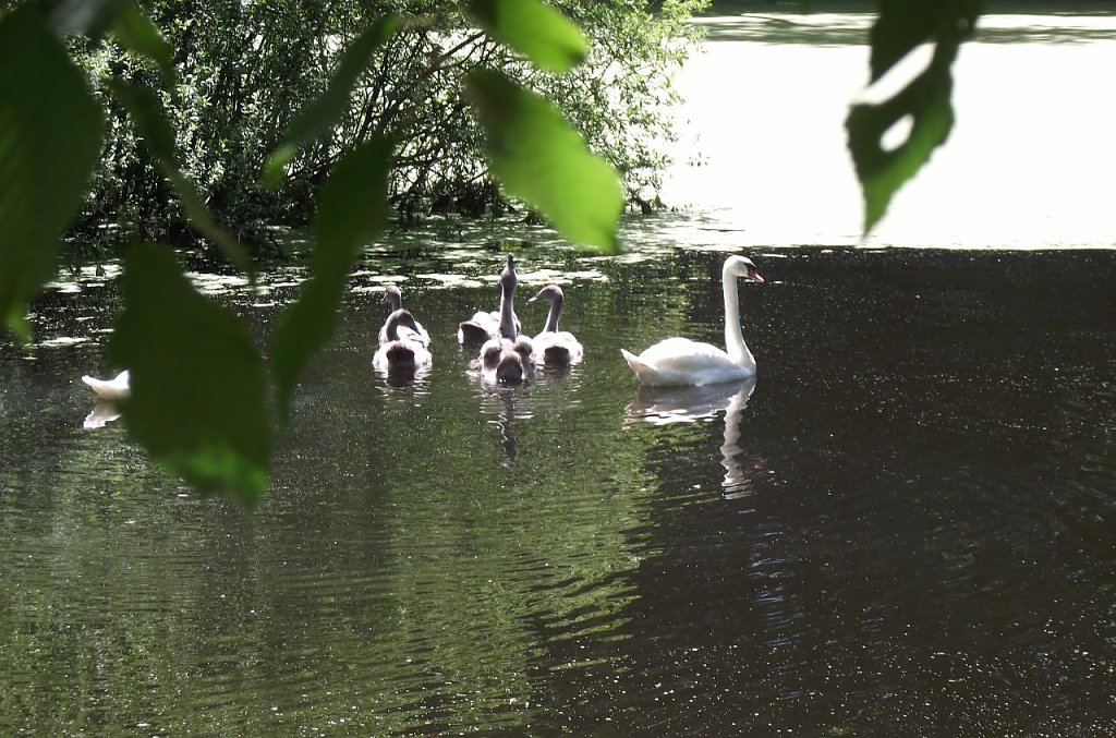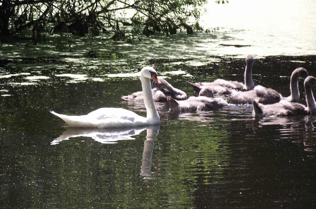 Auf einer Bank an einem der Teiche verweilend, bekam uns die Ruhe. Im Blau des Himmelns zogen Rotmilan und Bussard ihre Kreise, während im Flachwasser des über die Ufer getretenen Teiches die Frösche ein Konzert gaben, ein Graureiher nach einem Leckerbissen spähte. Der Blick schweift nach Liebenrode oder Böttchers Anwesen. Auf einer Weide im Hintergrund grasten Pferde. 60 habe der Tierexperte, will die junge Pferdesportlerin wissen. Ein schmaler Übergang führt in ein anderes Gewässers, ebenso von Laubbäumen umgeben. Der Wind spielte, leise säuselnd, mit den Blättern. Eine kleine Insel mitten im See. Am großen Ufer machte es sich eine Schwanenfamilie gemütlich. Bis zum flugfähigen Alter ihres fünffachen Nachwuchses wird es noch dauern. Was war denn das? Ein fliegender Diamant? Das Fernglas machte einen Eisvogel aus. Auf einem abgestorbenen Ast sitzend, wartete er geduldig auf kleine Fische. Ein sehr seltenes Erlebnis.