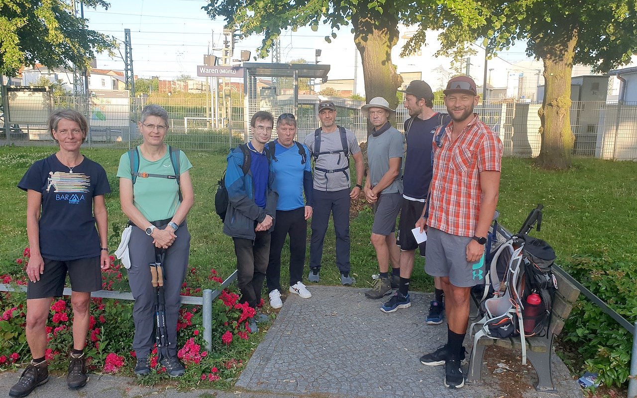 Um allen Eventualitäten zu entgehen, waren wir neun Teilnehmer schon am Abend zuvor angereist und hatten in Waren übernachtet. Meine Mitwanderinnen und Mitwanderer kamen aus vielen Teilen Deutschlands, aus dem Vogtland, München, Halle, dem Großraum Berlin, Rostock, Jena und Nordhausen. Der 2020 verstorbene Alfred Borchert hätte sich über eine geografisch so bunte Truppe gewiss gefreut.