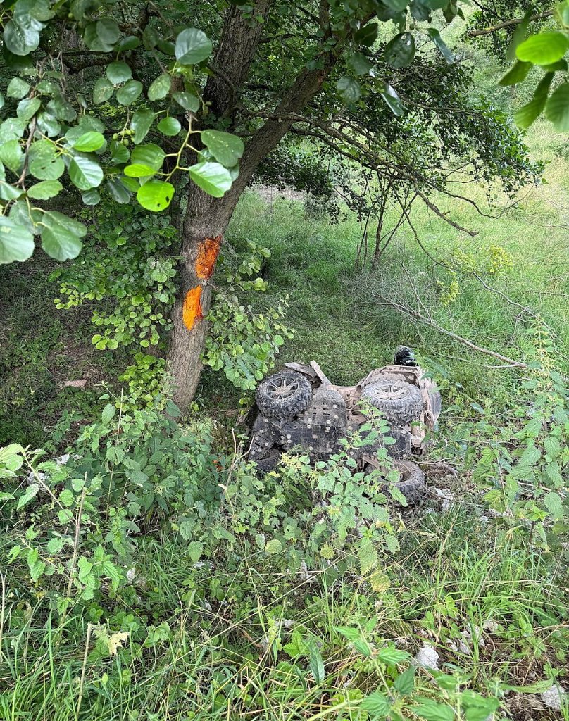 Aus bisher ungeklärter Ursache kam das Quad von der Fahrbahn ab und stürzte ca. fünf bis sechs Meter die Böschung herunter. Dabei kollidierte das Fahrzeug noch mit einem Baum, ehe es unten liegen blieb. Bei dem Unfall wurde der 45-jährige Fahrer schwer, sowie ein 10-jähriger Mitfahrer nach ersten Erkenntnissen leicht verletzt.