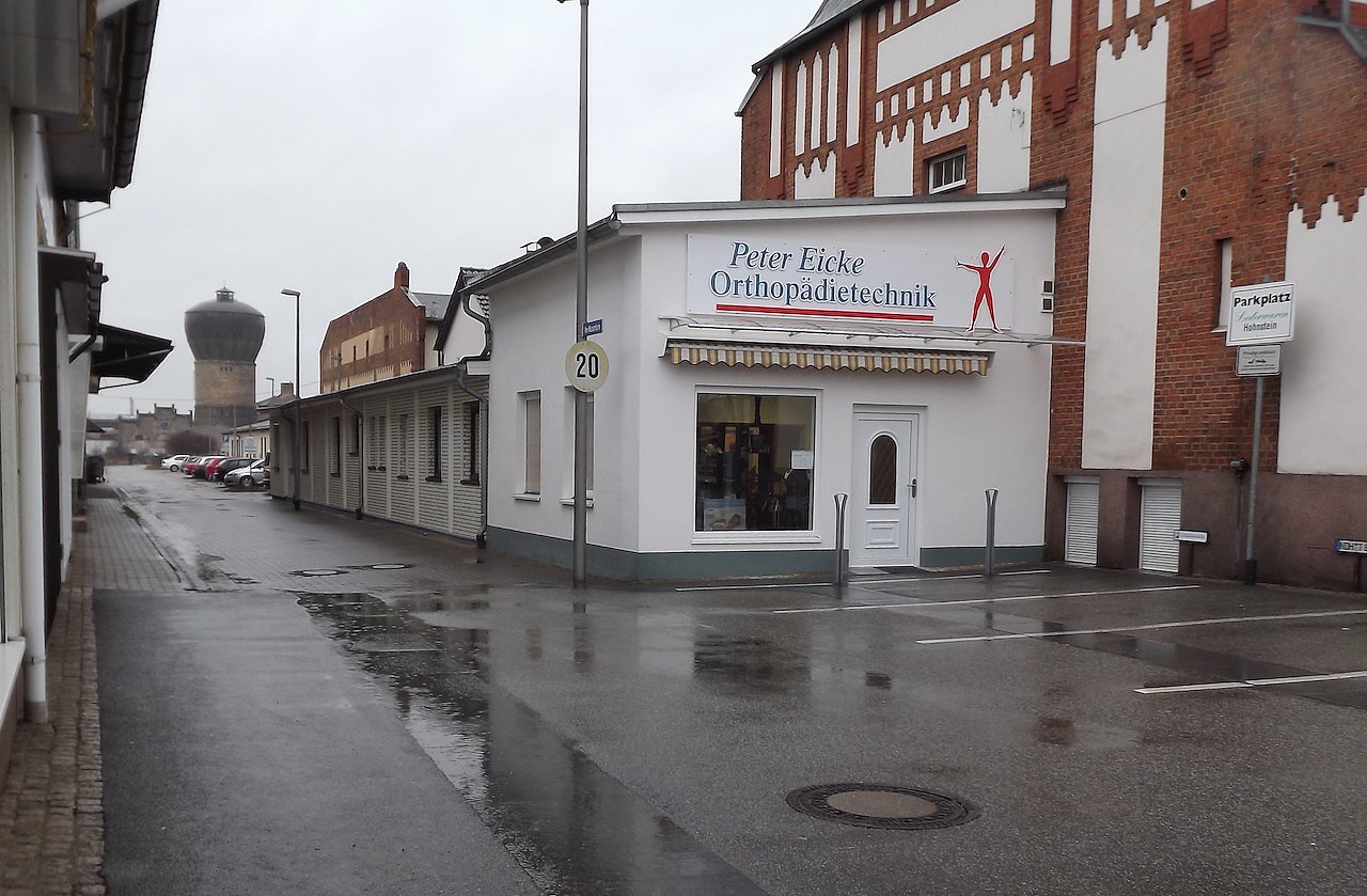 Am 17.12. 2010 sah es dort trist aus. Das Gebäude der Orthopädietechnik und die ehemalige Kegelbahn stehen auf dem alten Gleisplanum der Harzquerbahn, deren damaliges Gleis kurz vor dem Wasserturm in einer nach rechts beginnenden S-Kurve zum Güterbahnhof der NWE führte. (Foto: W.Schwarzbach)